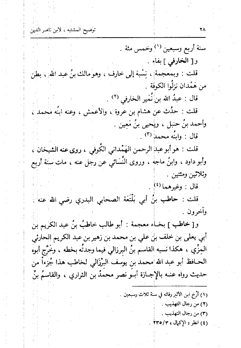 سنة أَربع وَسبعين وَخمْس مئة. و [الخارفي] بفاء. قلت: وبمعجمة نِسْبَة إِلَى خارف وَهُوَ مَالك بن عبد الله بطن من هَمدَان نزلُوا الْكُوفَة. قَالَ: عبد الله بن نمير الخارفي. قلت: حدث عَن هِشَام بن عُرْوَة وَالْأَعْمَش وَعنهُ ابْنه مُحَمَّد وَأحمد بن حَنْبَل وَيحيى بن معِين. قَالَ: وَابْنه مُحَمَّد. قلت: هُوَ أَبُو عبد الرَّحْمَن الْهَمدَانِي الْكُوفِي روى عَنهُ الشَّيْخَانِ وَأَبُو دَاوُد وَابْن مَاجَه وروى النَّسَائِيّ عَن رجل عَنهُ مَاتَ سنة أَربع وَثَلَاثِينَ ومئتين. قَالَ: وَغَيرهمَا. قلت: حَاطِب بن أبي بلتعة الصَّحَابِيّ البدري رَضِي الله عَنهُ. وَآخَرُونَ. و [خَاطب] بخاء مُعْجمَة: أَبُو طَالب خَاطب بن عبد الْكَرِيم بن أبي يعلى بن خلف بن عَليّ بن مُحَمَّد بن زُهَيْر بن عبد الْكَرِيم الْحَارِثِيّ الْمزي هَكَذَا نسبه الْقَاسِم بن البرزالي فِيمَا وجدته بِخَطِّهِ وَخرج أَبوهُ الْحَافِظ أَبُو عبد الله مُحَمَّد بن يُوسُف البرزالي لخاطب هَذَا جُزْءا من حَدِيث رَوَاهُ عَنهُ بِالْإِجَازَةِ أَبُو نصر مُحَمَّد بن الثراري وَالقَاسِم بن