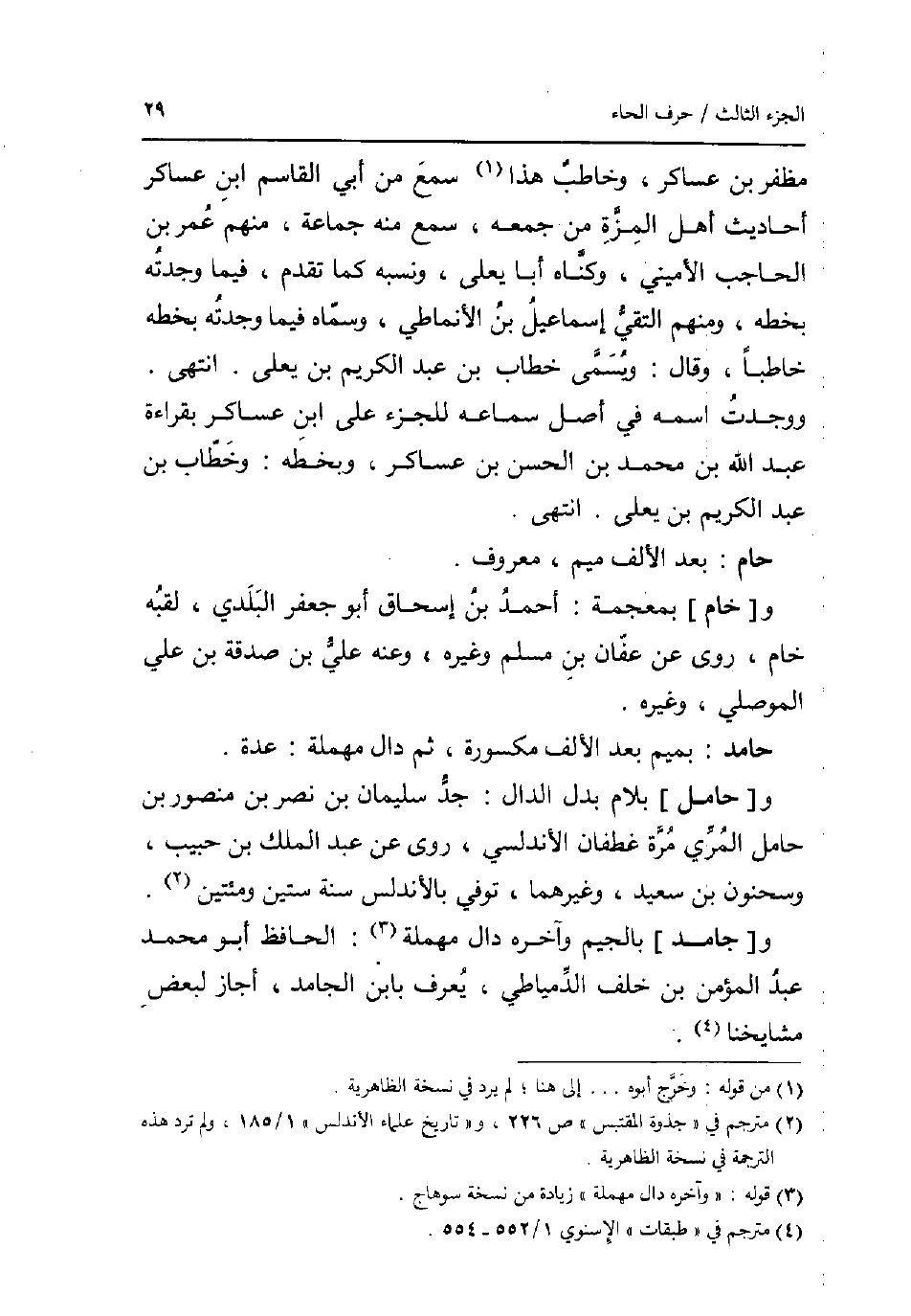 مظفر بن عَسَاكِر وخاطب هَذَا سمع من أبي الْقَاسِم ابْن عَسَاكِر أَحَادِيث أهل المزة من جمعه سمع مِنْهُ جمَاعَة مِنْهُم عمر بن الْحَاجِب الأميني وكناه أَبَا يعلى وَنسبه كَمَا تقدم فِيمَا وجدته بِخَطِّهِ وَمِنْهُم التقي إِسْمَاعِيل بن الْأنمَاطِي وَسَماهُ فِيمَا وجدته بِخَطِّهِ خاطبا وَقَالَ: وَيُسمى خطاب بن عبد الْكَرِيم بن يعلى. انْتهى. وَوجدت اسْمه فِي أصل سَمَاعه للجزء على ابْن عَسَاكِر بِقِرَاءَة عبد الله بن مُحَمَّد بن الْحسن بن عَسَاكِر وبخطه: وخطاب بن عبد الْكَرِيم بن يعلى. انْتهى. حام: بعد الْألف مِيم مَعْرُوف. و [خام] بِمُعْجَمَة: أَحْمد بن إِسْحَاق أَبُو جَعْفَر الْبَلَدِي لقبه خام روى عَن عَفَّان بن مُسلم وَغَيره وَعنهُ عَليّ بن صَدَقَة بن عَليّ الْموصِلِي وَغَيره. حَامِد: بميم بعد الْألف مَكْسُورَة ثمَّ دَال مُهْملَة: عدَّة. و [حَامِل] بلام بدل الدَّال: جد سُلَيْمَان بن نصر بن مَنْصُور بن حَامِل المري مرّة غطفان الأندلسي روى عَن عبد الْملك بن حبيب وَسَحْنُون بن سعيد وَغَيرهمَا توفّي بالأندلس سنة سِتِّينَ ومئتين. و [جامد] بِالْجِيم وَآخره دَال مُهْملَة: الْحَافِظ أَبُو مُحَمَّد عبد الْمُؤمن بن خلف الدمياطي يعرف بِابْن الجامد أجَاز لبَعض مَشَايِخنَا.
