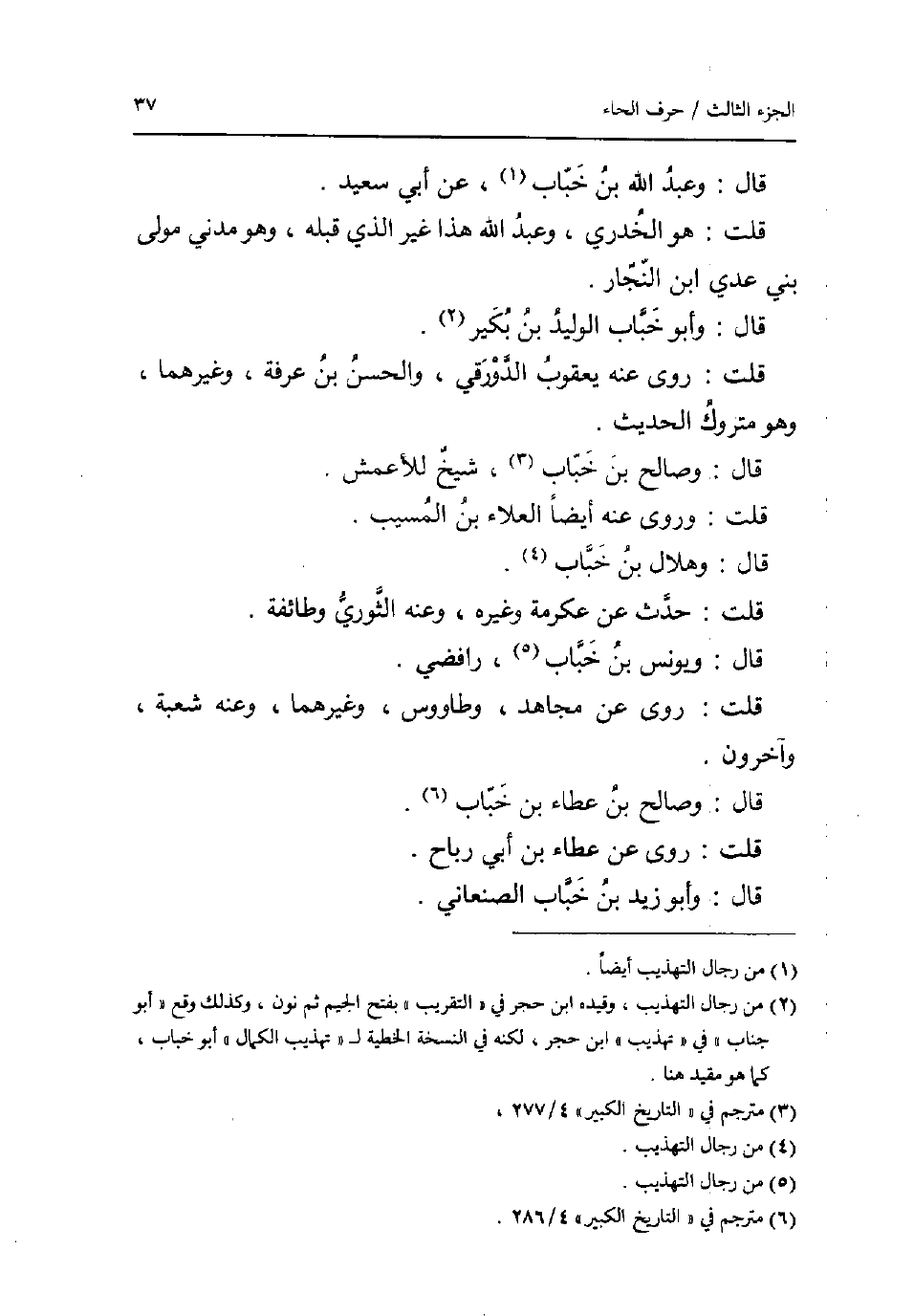 قَالَ: وَعبد الله بن خباب عَن أبي سعيد. قلت: هُوَ الْخُدْرِيّ وَعبد الله هَذَا غير الَّذِي قبله وَهُوَ مدنِي مولى بني عدي ابْن النجار. قَالَ: وَأَبُو خباب الْوَلِيد بن بكير. قلت: روى عَنهُ يَعْقُوب الدَّوْرَقِي وَالْحسن بن عَرَفَة وَغَيرهمَا وَهُوَ مَتْرُوك الحَدِيث. قَالَ: وَصَالح بن خباب شيخ للأعمش. قلت: وروى عَنهُ أَيْضا الْعَلَاء بن الْمسيب. قَالَ: وهلال بن خباب. قلت: حدث عَن عِكْرِمَة وَغَيره وَعنهُ الثَّوْريّ وَطَائِفَة. قَالَ: وَيُونُس بن خباب رَافِضِي. قلت: روى عَن مُجَاهِد وطاووس وَغَيرهمَا وَعنهُ شُعْبَة وَآخَرُونَ. قَالَ: وَصَالح بن عَطاء بن خباب. قلت: روى عَن عَطاء بن أبي رَبَاح. قَالَ: وَأَبُو زيد بن خباب الصَّنْعَانِيّ.