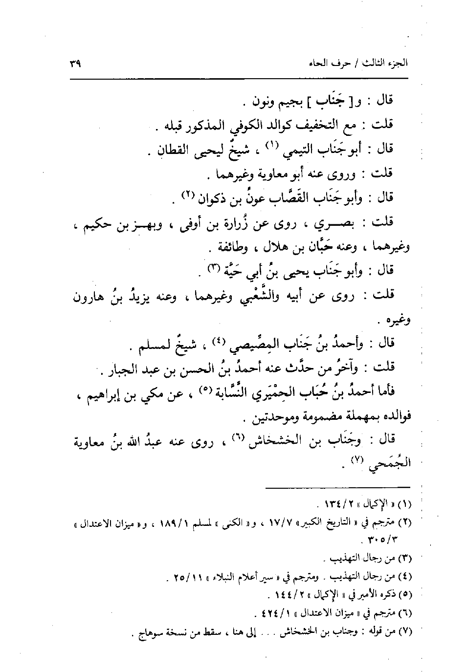 قَالَ: و [جناب] بجيم وَنون. قلت: مَعَ التَّخْفِيف كوالد الْكُوفِي الْمَذْكُور قبله. قَالَ: أَبُو جناب التَّيْمِيّ شيخ ليحيى الْقطَّان. قلت: وروى عَنهُ أَبُو مُعَاوِيَة وَغَيرهمَا. قَالَ: وَأَبُو جناب القصاب عون بن ذكْوَان. قلت: بَصرِي روى عَن زُرَارَة بن أوفى وبهز بن حَكِيم وَغَيرهمَا وَعنهُ حبَان بن هِلَال وَطَائِفَة. قَالَ: وَأَبُو جناب يحيى بن أبي حَيَّة. قلت: روى عَن أَبِيه وَالشعْبِيّ وَغَيرهمَا وَعنهُ يزِيد بن هَارُون وَغَيره. قَالَ: وَأحمد بن جناب المصِّيصِي شيخ لمُسلم. قلت: وَآخر من حدث عَنهُ أَحْمد بن الْحسن بن عبد الْجَبَّار. فَأَما أَحْمد بن حباب الْحِمْيَرِي النسابة عَن مكي بن إِبْرَاهِيم فوالده بِمُهْملَة مَضْمُومَة وموحدتين. قَالَ: وجناب بن الخشخاش روى عَنهُ عبد الله بن مُعَاوِيَة الجُمَحِي.