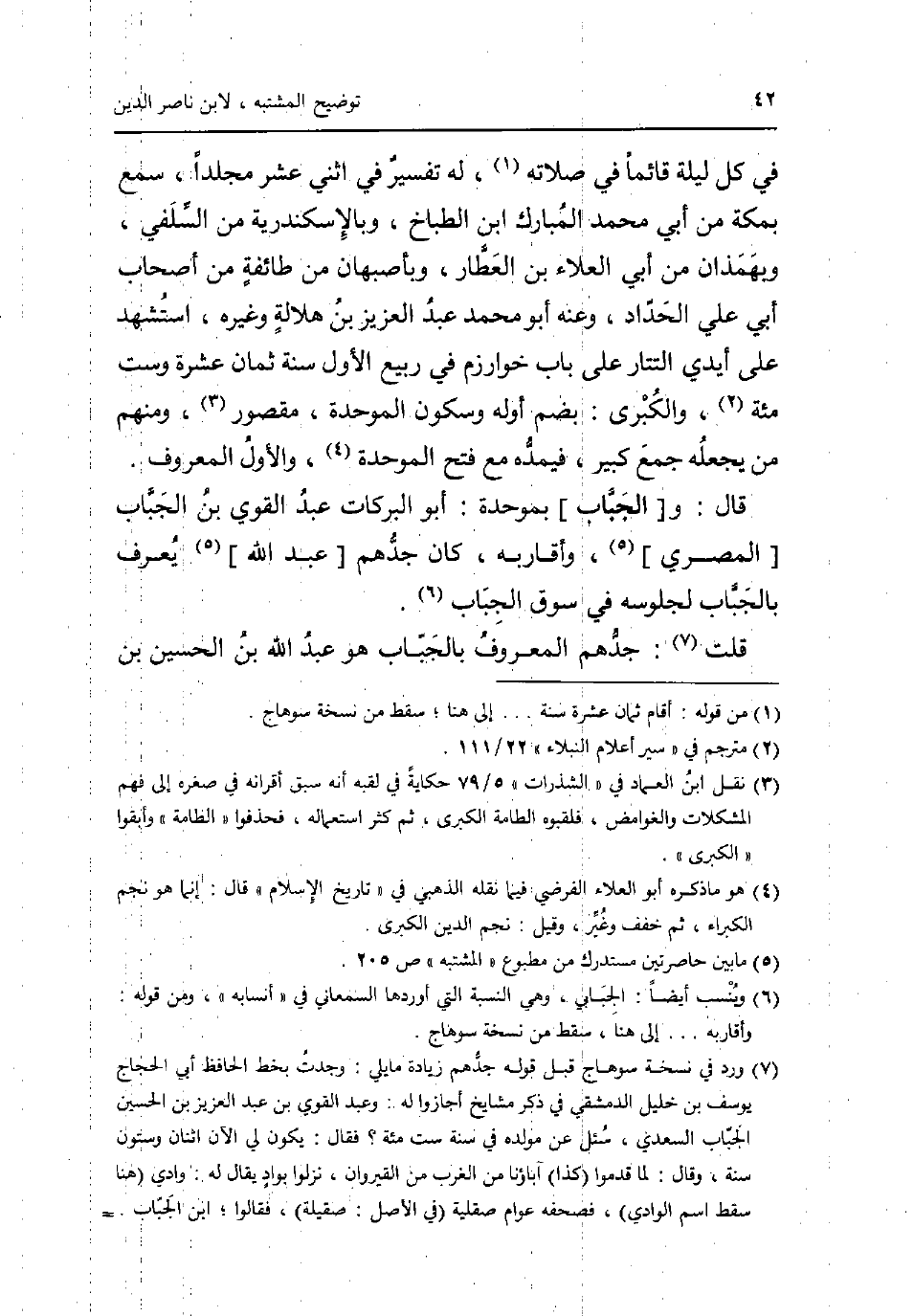 فِي كل لَيْلَة قَائِما فِي صلَاته لَهُ تَفْسِير فِي اثْنَي عشر مجلدا سمع بِمَكَّة من أبي مُحَمَّد الْمُبَارك ابْن الطباخ وبالإسكندرية من السلَفِي وبهمذان من أبي الْعَلَاء بن الْعَطَّار وبأصبهان من طَائِفَة من أَصْحَاب أبي عَليّ الْحداد وَعنهُ أَبُو مُحَمَّد عبد الْعَزِيز بن هلالة وَغَيره. اسْتشْهد على أَيدي التتار على بَاب خوارزم فِي ربيع الأول سنة ثَمَان عشرَة وست مئة والكبرى: بِضَم أَوله وَسُكُون الْمُوَحدَة مَقْصُور وَمِنْهُم من يَجعله جمع كَبِير فيمده مَعَ فتح الْمُوَحدَة وَالْأول الْمَعْرُوف. قَالَ: و [الْجبَاب] بموحدة: أَبُو البركات عبد الْقوي بن الْجبَاب [الْمصْرِيّ] وأقاربه كَانَ جدهم [عبد الله] يعرف بالجباب لجلوسه فِي سوق الْجبَاب. قلت: جدهم الْمَعْرُوف بالجباب هُوَ عبد الله بن الْحُسَيْن بن