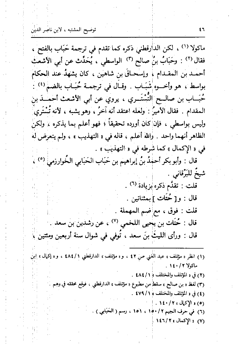 مَاكُولَا لَكِن الدَّارَقُطْنِيّ ذكره كَمَا تقدم فِي تَرْجَمَة حباب بِالْفَتْح فَقَالَ: وحباب بن صَالح الوَاسِطِيّ يحدث عَن أبي الْأَشْعَث أَحْمد بن الْمِقْدَام وَإِسْحَاق بن شاهين كَانَ يشْهد عِنْد الْحُكَّام بواسط هُوَ وَأَخُوهُ شباب. وَقَالَ فِي تَرْجَمَة حباب بِالضَّمِّ: حباب بن صَالح التسترِي يروي عَن أبي الْأَشْعَث أَحْمد بن الْمِقْدَام فَقَالَ الْأَمِير: وَلَعَلَّه اعْتقد أَنه آخر وَهُوَ يشبه لِأَنَّهُ تستري وَلَيْسَ بواسطي فَإِن كَانَ أوردهُ تَحْقِيقا؛ فَهُوَ أعلم بِمَا يذكرهُ وَلَكِن الظَّاهِر أَنَّهُمَا وَاحِد. وَالله أعلم قَالَه فِي التَّهْذِيب وَلم يتَعَرَّض لَهُ فِي الْإِكْمَال كَمَا شَرطه فِي التَّهْذِيب. قَالَ: وَأَبُو بكر أَحْمد بن إِبْرَاهِيم بن حباب الحبابي الْخَوَارِزْمِيّ شيخ للبرقاني. قلت: تقدم ذكره بِزِيَادَة. قَالَ: و [حتات] بمثناتين. قلت: فَوق مَعَ ضم الْمُهْملَة. قَالَ: حتات بن يحيى اللَّخْمِيّ عَن رشدين بن سعد. قَالَ: وَرَأى اللَّيْث بن سعد توفّي فِي شَوَّال سنة أَرْبَعِينَ ومئتين