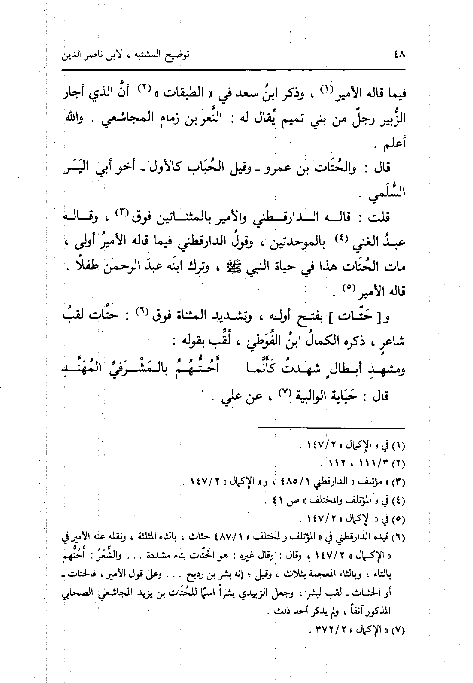 فِيمَا قَالَه الْأَمِير وَذكر ابْن سعد فِي الطَّبَقَات أَن الَّذِي أَجَارَ الزبير رجل من بني تَمِيم يُقَال لَهُ: النعر بن زِمَام الْمُجَاشِعِي. وَالله أعلم. قَالَ: والحتات بن عَمْرو _ وَقيل الْحباب كَالْأولِ _ أَخُو أبي الْيُسْر السّلمِيّ. قلت: قَالَه الدَّارَقُطْنِيّ والأمير بالمثناتين فَوق وَقَالَهُ عبد الْغَنِيّ بالموحدتين وَقَول الدَّارَقُطْنِيّ فِيمَا قَالَه الْأَمِير أولى مَاتَ الحتات هَذَا فِي حَيَاة النَّبِي صلى الله عَلَيْهِ وَسلم وَترك ابْنه عبد الرَّحْمَن طفْلا. قَالَه الْأَمِير. و [حتات] بِفَتْح أَوله وَتَشْديد الْمُثَنَّاة فَوق: حتات لقب شَاعِر ذكره الْكَمَال ابْن الفوطي لقب بقوله: