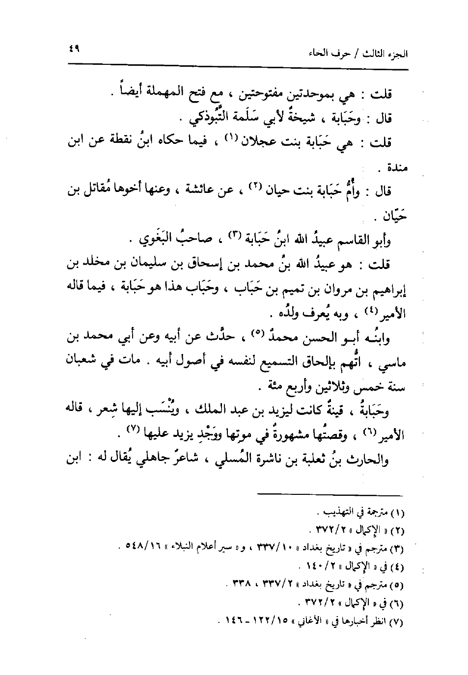قلت: هِيَ بموحدتين مفتوحتين مَعَ فتح الْمُهْملَة أَيْضا. قَالَ: وحبابة شيخة لأبي سَلمَة التَّبُوذَكِي. قلت: هِيَ حبابة بنت عجلَان فِيمَا حَكَاهُ ابْن نقطة عَن ابْن مندة. قَالَ: وَأم حبابة بنت حَيَّان عَن عَائِشَة وعنها أَخُوهَا مقَاتل بن حَيَّان. وَأَبُو الْقَاسِم عبيد الله ابْن حبابة صَاحب الْبَغَوِيّ. قلت: هُوَ عبيد الله بن مُحَمَّد بن إِسْحَاق بن سُلَيْمَان بن مخلد بن إِبْرَاهِيم بن مَرْوَان بن تَمِيم بن حباب وحباب هَذَا هُوَ حبابة فِيمَا قَالَه الْأَمِير وَبِه يعرف وَلَده. وَابْنه أَبُو الْحسن مُحَمَّد حدث عَن أَبِيه وَعَن أبي مُحَمَّد بن ماسي اتهمَ بإلحاق التسميع لنَفسِهِ فِي أصُول أَبِيه. مَاتَ فِي شعْبَان سنة خمس وَثَلَاثِينَ وَأَرْبع مئة. وحبابة قينة كَانَت ليزِيد بن عبد الْملك وينسب إِلَيْهَا شعر قَالَه الْأَمِير وقصتها مَشْهُورَة فِي مَوتهَا وَوجد يزِيد عَلَيْهَا. والْحَارث بن ثَعْلَبَة بن نَاشِرَة الْمسلي شَاعِر جاهلي يُقَال لَهُ: ابْن
