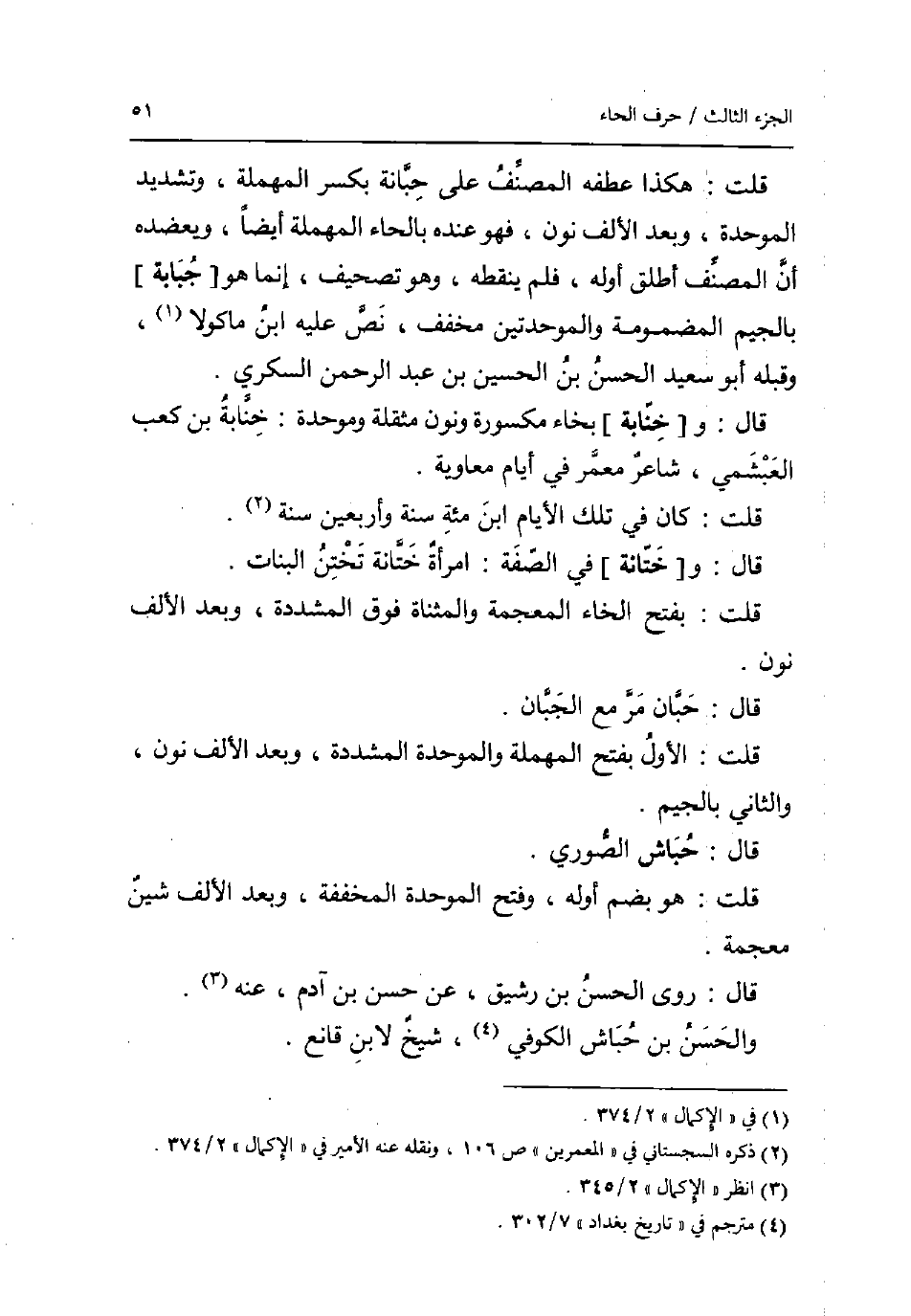 قلت: هَكَذَا عطفه المُصَنّف على حبانة بِكَسْر الْمُهْملَة وَتَشْديد الْمُوَحدَة وَبعد الْألف نون فَهُوَ عِنْده بِالْحَاء الْمُهْملَة أَيْضا ويعضده أَن المُصَنّف أطلق أَوله فَلم ينقطه وَهُوَ تَصْحِيف إِنَّمَا هُوَ [جبابة] بِالْجِيم المضمومة والموحدتين مخفف نَص عَلَيْهِ ابْن مَاكُولَا وَقَبله أَبُو سعيد الْحسن بن الْحُسَيْن بن عبد الرَّحْمَن السكرِي. قَالَ: و [خنابة] بخاء مَكْسُورَة وَنون مثقلة وموحدة: خنابة بن كَعْب العبشمي شَاعِر معمر فِي أَيَّام مُعَاوِيَة. قلت: كَانَ فِي تِلْكَ الْأَيَّام ابْن مئة سنة وَأَرْبَعين سنة. قَالَ: و [ختانة] فِي الصّفة: امْرَأَة ختانة تختن الْبَنَات. قلت: بِفَتْح الْخَاء الْمُعْجَمَة والمثناة فَوق الْمُشَدّدَة وَبعد الْألف نون. قَالَ: حبَان مر مَعَ الجبان. قلت: الأول بِفَتْح الْمُهْملَة وَالْمُوَحَّدَة الْمُشَدّدَة وَبعد الْألف نون وَالثَّانِي بِالْجِيم. قَالَ: حباش الصُّورِي. قلت: هُوَ بِضَم أَوله وَفتح الْمُوَحدَة المخففة وَبعد الْألف شين مُعْجمَة. قَالَ: روى الْحسن بن رَشِيق عَن حسن بن آدم عَنهُ. وَالْحسن بن حباش الْكُوفِي شيخ لِابْنِ قَانِع.