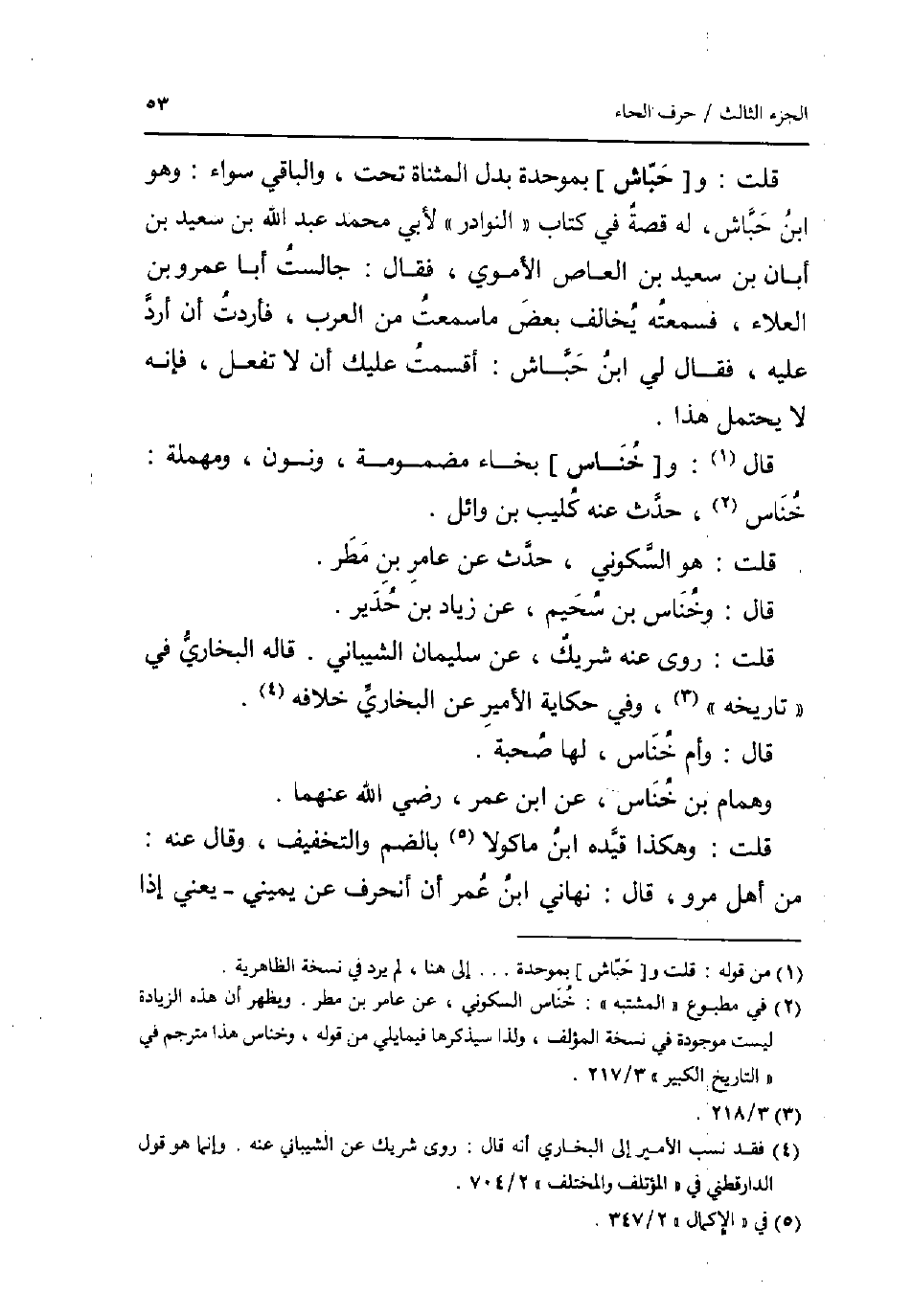 قلت: و [حباش] بموحدة بدل الْمُثَنَّاة تَحت وَالْبَاقِي سَوَاء: وَهُوَ ابْن حباش لَهُ قصَّة فِي كتاب النَّوَادِر لأبي مُحَمَّد عبد الله بن سعيد بن أبان بن سعيد بن الْعَاصِ الْأمَوِي فَقَالَ: جالست أَبَا عَمْرو بن الْعَلَاء فَسَمعته يُخَالف بعض مَا سَمِعت من الْعَرَب فَأَرَدْت أَن أرد عَلَيْهِ فَقَالَ لي ابْن حباش: أَقْسَمت عَلَيْك أَن لَا تفعل فَإِنَّهُ لَا يحْتَمل هَذَا. قَالَ: و [خناس] بخاء مَضْمُومَة وَنون ومهملة: خناس حدث عَنهُ كُلَيْب بن وَائِل. قلت: هُوَ السكونِي حدث عَن عَامر بن مطر. قَالَ: وخناس بن سحيم عَن زِيَاد بن حدير. قلت: روى عَنهُ شريك عَن سُلَيْمَان الشَّيْبَانِيّ. قَالَه البُخَارِيّ فِي تَارِيخه وَفِي حِكَايَة الْأَمِير عَن البُخَارِيّ خِلَافه. قَالَ: وَأم خناس لَهَا صُحْبَة. وَهَمَّام بن خناس عَن ابْن عمر رَضِي الله عَنْهُمَا. قلت: وَهَكَذَا قَيده ابْن مَاكُولَا بِالضَّمِّ وَالتَّخْفِيف وَقَالَ عَنهُ: من أهل مرو قَالَ: نهاني ابْن عمر أَن أنحرف عَن يَمِيني _ يَعْنِي إِذا