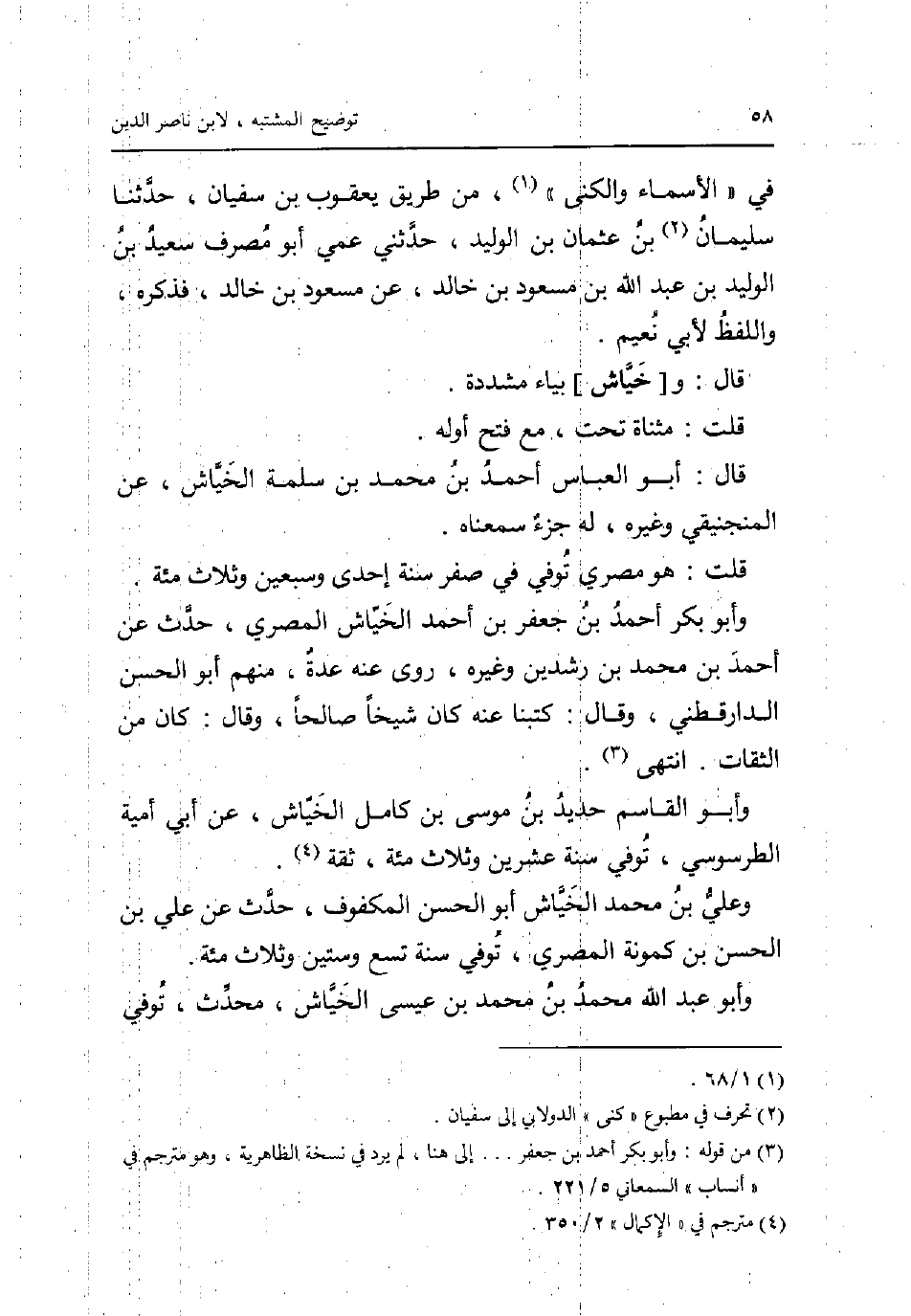فِي الْأَسْمَاء والكنى من طَرِيق يَعْقُوب بن سُفْيَان حَدثنَا سُلَيْمَان بن عُثْمَان بن الْوَلِيد حَدثنِي عمي أَبُو مصرف سعيد بن الْوَلِيد بن عبد الله بن مَسْعُود بن خَالِد عَن مَسْعُود بن خَالِد فَذكره وَاللَّفْظ لأبي نعيم. قَالَ: و [خياش] بياء مُشَدّدَة. قلت: مثناة تَحت مَعَ فتح أَوله. قَالَ: أَبُو الْعَبَّاس أَحْمد بن مُحَمَّد بن سَلمَة الخياش عَن المنجنيقي وَغَيره لَهُ جُزْء سمعناه. قلت: هُوَ مصري توفّي فِي صفر سنة إِحْدَى وَسبعين وَثَلَاث مئة. وَأَبُو بكر أَحْمد بن جَعْفَر بن أَحْمد الخياش الْمصْرِيّ حدث عَن أَحْمد بن مُحَمَّد بن رشدين وَغَيره روى عَنهُ عدَّة مِنْهُم أَبُو الْحسن الدَّارَقُطْنِيّ وَقَالَ: كتبنَا عَنهُ كَانَ شَيخا صَالحا وَقَالَ: كَانَ من الثِّقَات. انْتهى. وَأَبُو الْقَاسِم حَدِيد بن مُوسَى بن كَامِل الخياش عَن أبي أُميَّة الطرسوسي توفّي سنة عشْرين وَثَلَاث مئة ثِقَة. وَعلي بن مُحَمَّد الخياش أَبُو الْحسن المكفوف حدث عَن عَليّ بن الْحسن بن كمونة الْمصْرِيّ توفّي سنة تسع وَسِتِّينَ وَثَلَاث مئة. وَأَبُو عبد الله مُحَمَّد بن مُحَمَّد بن عِيسَى الخياش مُحدث توفّي