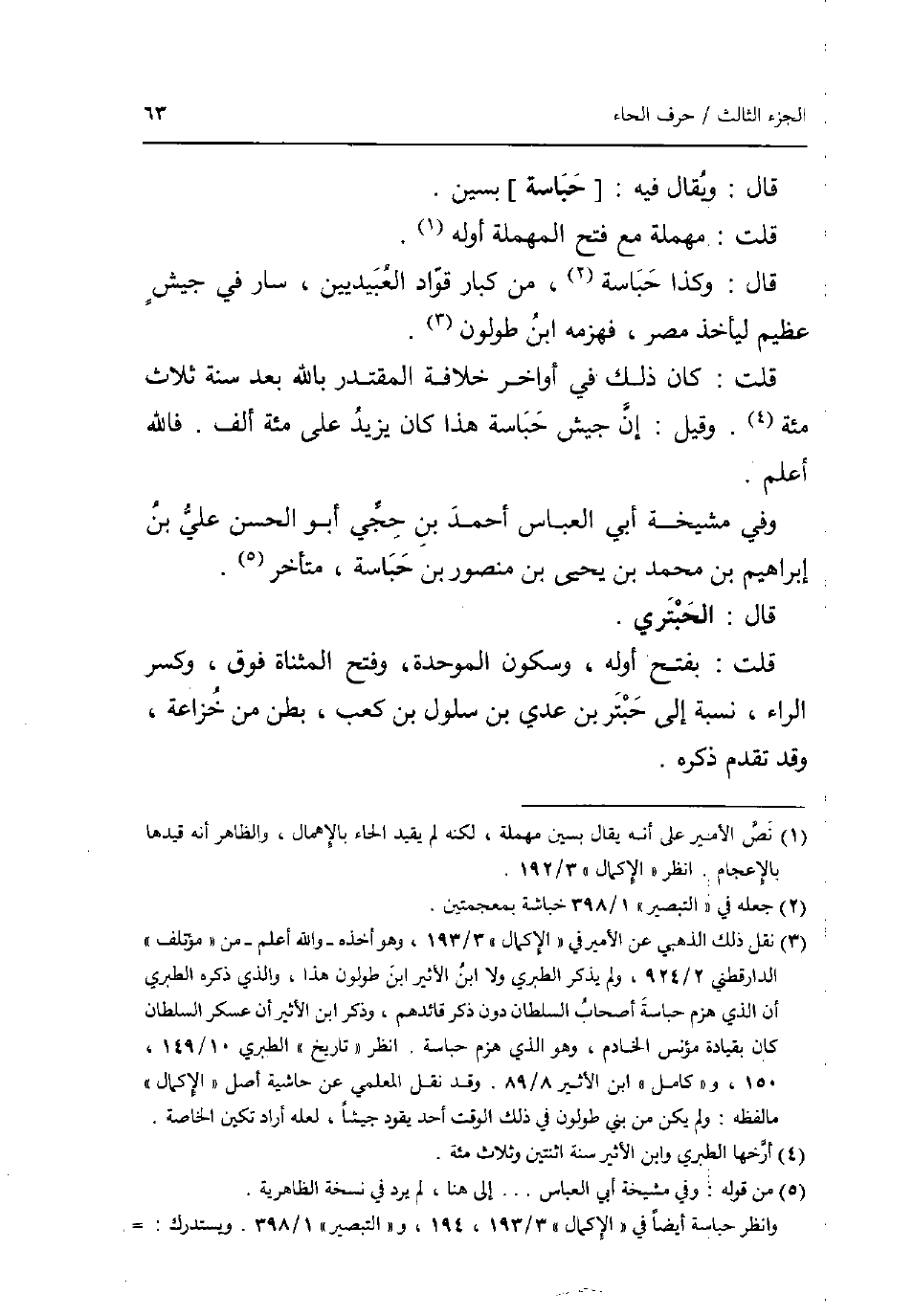قَالَ: وَيُقَال فِيهِ: [حباسة] بسين. قلت: مُهْملَة مَعَ فتح الْمُهْملَة أَوله. قَالَ: وَكَذَا حباسة من كبار قواد العبيديين سَار فِي جَيش عَظِيم ليَأْخُذ مصر فَهَزَمَهُ ابْن طولون. قلت: كَانَ ذَلِك فِي أَوَاخِر خلَافَة المقتدر بِاللَّه بعد سنة ثَلَاث مئة. وَقيل: إِن جَيش حباسة هَذَا كَانَ يزِيد على مئة ألف. فَالله أعلم. وَفِي مشيخة أبي الْعَبَّاس أَحْمد بن حجي أَبُو الْحسن عَليّ بن إِبْرَاهِيم بن مُحَمَّد بن يحيى بن مَنْصُور بن حباسة مُتَأَخّر. قَالَ: الحبتري. قلت: بِفَتْح أَوله وَسُكُون الْمُوَحدَة وَفتح الْمُثَنَّاة فَوق وَكسر الرَّاء نِسْبَة إِلَى حبتر بن عدي بن سلول بن كَعْب بطن من خُزَاعَة وَقد تقدم ذكره.