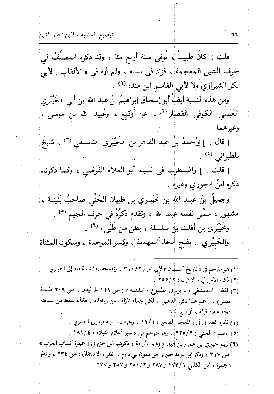 قلت: كَانَ طَبِيبا توفّي سنة أَربع مئة وَقد ذكره المُصَنّف فِي حرف الشين الْمُعْجَمَة فَزَاد فِي نسبه وَلم أره فِي الألقاب لأبي بكر الشِّيرَازِيّ وَلَا لأبي الْقَاسِم ابْن مَنْدَه. وَمن هَذِه النِّسْبَة أَيْضا أَبُو إِسْحَاق إِبْرَاهِيم بن عبد الله بن أبي الْخَيْبَرِيّ الْعَبْسِي الْكُوفِي الْقصار عَن وَكِيع وَعبيد الله بن مُوسَى وَغَيرهمَا. [قَالَ:] وَأحمد بن عبد القاهر بن الْخَيْبَرِيّ الدِّمَشْقِي شيخ للطبراني. [قلت:] واضطرب فِي نسبته أَبُو الْعَلَاء الفرضي وكما ذَكرْنَاهُ ذكره ابْن الْجَوْزِيّ وَغَيره. وَجَمِيل بن عبد الله بن خيبري بن ظبْيَان الحني صَاحب بثينة مَشْهُور سمى نَفسه عبيد الله وَتقدم ذكره فِي حرف الْجِيم. وخيبري بن أفلت بن سلسلة بطن من طَيئ. والحبيري: بِفَتْح الْحَاء الْمُهْملَة وَكسر الْمُوَحدَة وَسُكُون الْمُثَنَّاة