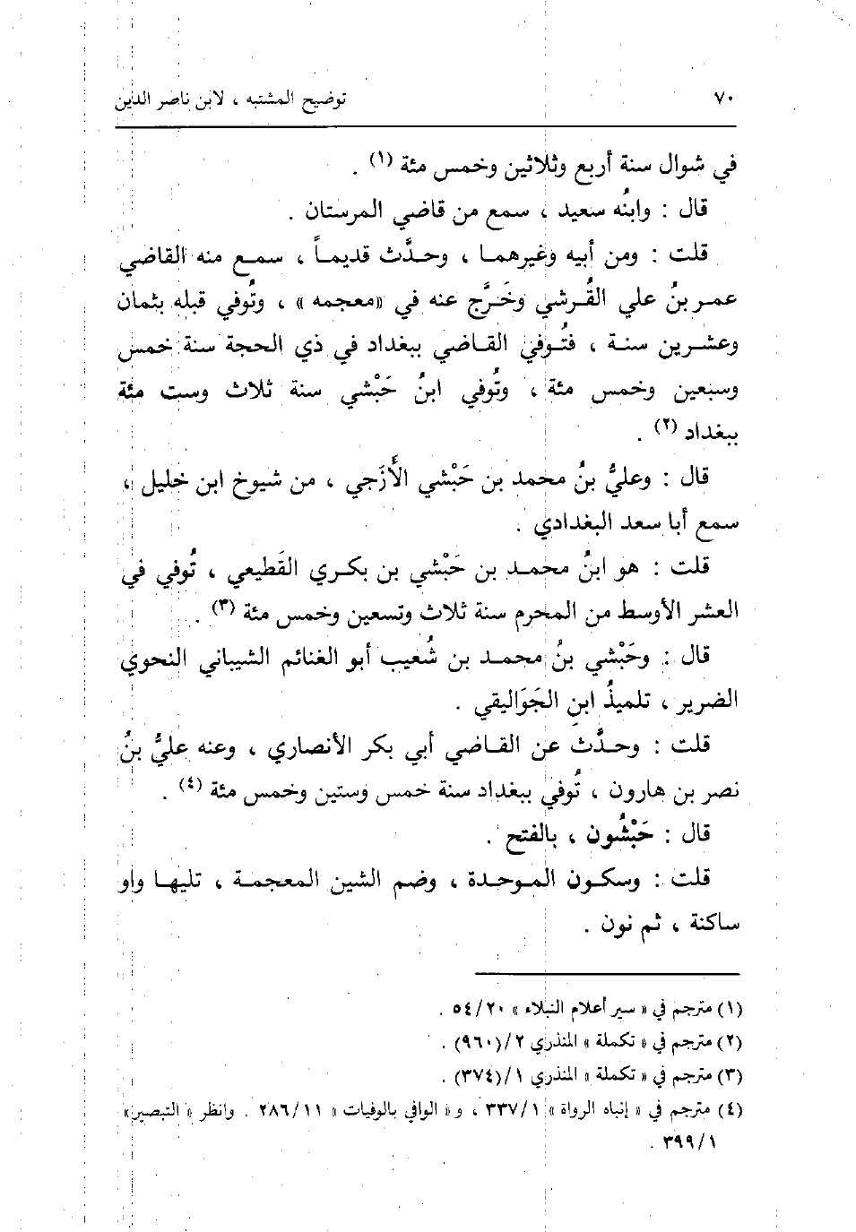 فِي شَوَّال سنة أَربع وَثَلَاثِينَ وَخمْس مئة. قَالَ: وَابْنه سعيد سمع من قَاضِي المرستان. قلت: وَمن أَبِيه وَغَيرهمَا وَحدث قَدِيما سمع مِنْهُ القَاضِي عمر بن عَليّ الْقرشِي وَخرج عَنهُ فِي مُعْجَمه وَتُوفِّي قبله بثمان وَعشْرين سنة فَتوفي القَاضِي بِبَغْدَاد فِي ذِي الْحجَّة سنة خمس وَسبعين وَخمْس مئة وَتُوفِّي ابْن حبشِي سنة ثَلَاث وست مئة بِبَغْدَاد. قَالَ: وَعلي بن مُحَمَّد بن حبشِي الْأَزجيّ من شُيُوخ ابْن خَلِيل سمع أَبَا سعد الْبَغْدَادِيّ. قلت: هُوَ ابْن مُحَمَّد بن حبشِي بن بكري الْقطيعِي توفّي فِي الْعشْر الْأَوْسَط من الْمحرم سنة ثَلَاث وَتِسْعين وَخمْس مئة. قَالَ: وَحبشِي بن مُحَمَّد بن شُعَيْب أَبُو الْغَنَائِم الشَّيْبَانِيّ النَّحْوِيّ الضَّرِير تلميذ ابْن الجواليقي. قلت: وَحدث عَن القَاضِي أبي بكر الْأنْصَارِيّ وَعنهُ عَليّ بن نصر بن هَارُون توفّي بِبَغْدَاد سنة خمس وَسِتِّينَ وَخمْس مئة. قَالَ: حبشون بِالْفَتْح. قلت: وَسُكُون الْمُوَحدَة وَضم الشين الْمُعْجَمَة تَلِيهَا وَاو سَاكِنة ثمَّ نون.