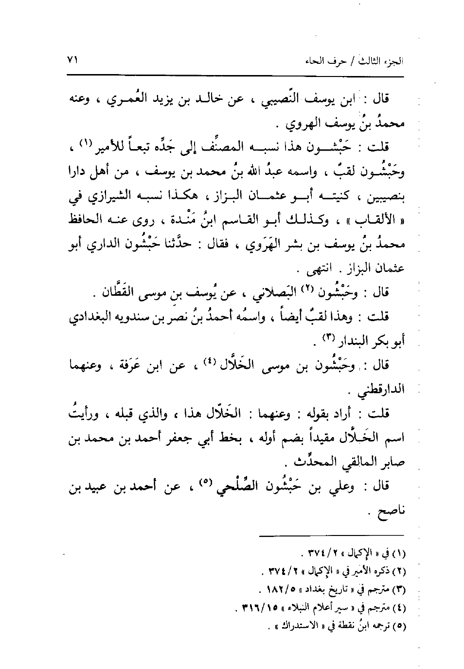 قَالَ: ابْن يُوسُف النصيبي عَن خَالِد بن يزِيد الْعمريّ وَعنهُ مُحَمَّد بن يُوسُف الْهَرَوِيّ. قلت: حبشون هَذَا نسبه المُصَنّف إِلَى جده تبعا للأمير وحبشون لقب واسْمه عبد الله بن مُحَمَّد بن يُوسُف من أهل دَارا بنصيبين كنيته أَبُو عُثْمَان الْبَزَّاز هَكَذَا نسبه الشِّيرَازِيّ فِي الألقاب وَكَذَلِكَ أَبُو الْقَاسِم ابْن مندة روى عَنهُ الْحَافِظ مُحَمَّد بن يُوسُف بن بشر الْهَرَوِيّ فَقَالَ: حَدثنَا حبشون الدَّارِيّ أَبُو عُثْمَان الْبَزَّاز. انْتهى. قَالَ: وحبشون البصلاني عَن يُوسُف بن مُوسَى الْقطَّان. قلت: وَهَذَا لقب أَيْضا واسْمه أَحْمد بن نصر بن سندويه الْبَغْدَادِيّ أَبُو بكر البندار. قَالَ: وحبشون بن مُوسَى الْخلال عَن ابْن عَرَفَة وعنهما الدَّارَقُطْنِيّ. قلت: أَرَادَ بقوله: وعنهما: الْخلال هَذَا وَالَّذِي قبله وَرَأَيْت اسْم الْخلال مُقَيّدا بِضَم أَوله بِخَط أبي جَعْفَر أَحْمد بن مُحَمَّد بن صابر المالقي الْمُحدث. قَالَ: وَعلي بن حبشون الصلحي عَن أَحْمد بن عبيد بن نَاصح.