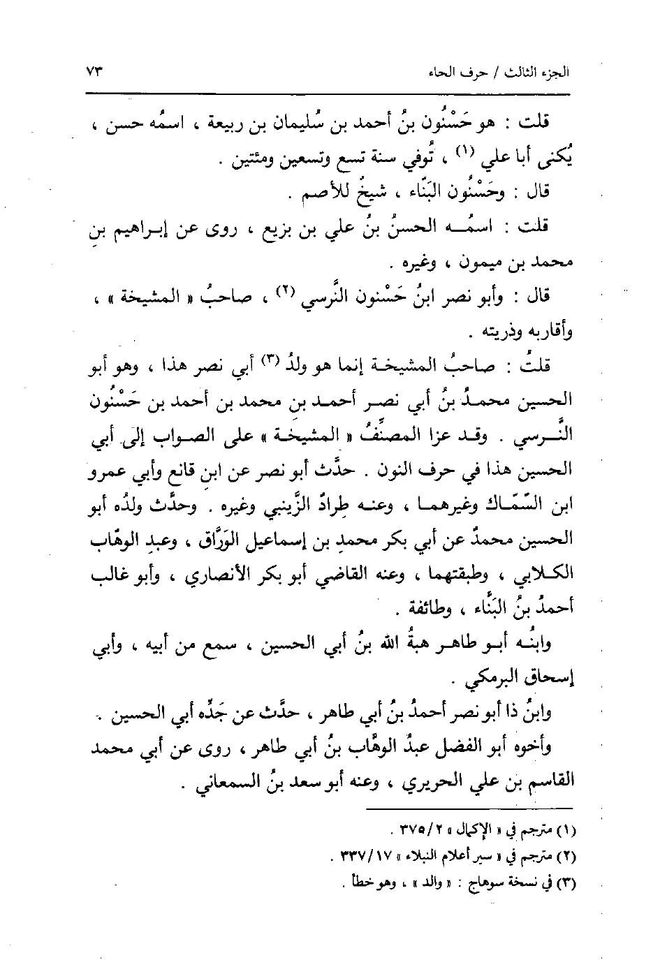 قلت: هُوَ حسنون بن أَحْمد بن سُلَيْمَان بن ربيعَة اسْمه حسن يكنى أَبَا عَليّ توفّي سنة تسع وَتِسْعين ومئتين. قَالَ: وحسنون الْبناء شيخ للأصم. قلت: اسْمه الْحسن بن عَليّ بن بزيع روى عَن إِبْرَاهِيم بن مُحَمَّد بن مَيْمُون وَغَيره. قَالَ: وَأَبُو نصر ابْن حسنون النَّرْسِي صَاحب المشيخة وأقاربه وَذريته. قلت: صَاحب المشيخة إِنَّمَا هُوَ ولد أبي نصر هَذَا وَهُوَ أَبُو الْحُسَيْن مُحَمَّد بن أبي نصر أَحْمد بن مُحَمَّد بن أَحْمد بن حسنون النَّرْسِي. وَقد عزا المُصَنّف المشيخة على الصَّوَاب إِلَى أبي الْحُسَيْن هَذَا فِي حرف النُّون. حدث أَبُو نصر عَن ابْن قَانِع وَأبي عَمْرو ابْن السماك وَغَيرهمَا وَعنهُ طراد الزَّيْنَبِي وَغَيره. وَحدث وَلَده أَبُو الْحُسَيْن مُحَمَّد عَن أبي بكر مُحَمَّد بن إِسْمَاعِيل الْوراق وَعبد الْوَهَّاب الْكلابِي وطبقتهما وَعنهُ القَاضِي أَبُو بكر الْأنْصَارِيّ وَأَبُو غَالب أَحْمد بن الْبناء وَطَائِفَة. وَابْنه أَبُو طَاهِر هبة الله بن أبي الْحُسَيْن سمع من أَبِيه وَأبي إِسْحَاق الْبَرْمَكِي. وَابْن ذَا أَبُو نصر أَحْمد بن أبي طَاهِر حدث عَن جده أبي الْحُسَيْن. وَأَخُوهُ أَبُو الْفضل عبد الْوَهَّاب بن أبي طَاهِر روى عَن أبي مُحَمَّد الْقَاسِم بن عَليّ الحريري وَعنهُ أَبُو سعد بن السَّمْعَانِيّ.