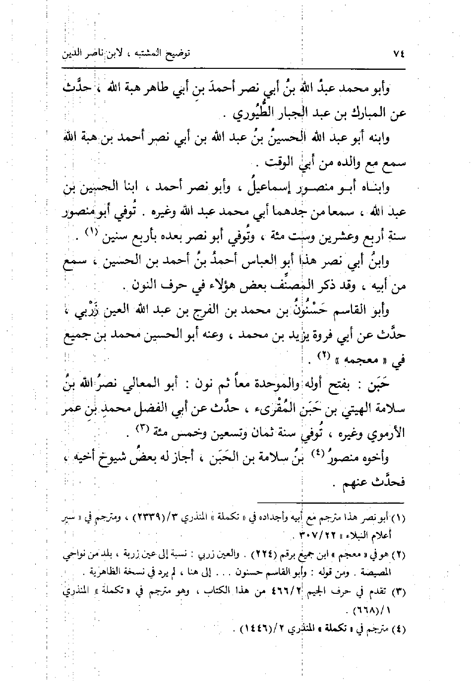وَأَبُو مُحَمَّد عبد الله بن أبي نصر أَحْمد بن أبي طَاهِر هبة الله حدث عَن الْمُبَارك بن عبد الْجَبَّار الطيوري. وَابْنه أَبُو عبد الله الْحُسَيْن بن عبد الله بن أبي نصر أَحْمد بن هبة الله سمع مَعَ وَالِده من أبي الْوَقْت. وابناه أَبُو مَنْصُور إِسْمَاعِيل وَأَبُو نصر أَحْمد ابْنا الْحُسَيْن بن عبد الله سمعا من جدهما أبي مُحَمَّد عبد الله وَغَيره. توفّي أَبُو مَنْصُور سنة أَربع وَعشْرين وست مئة وَتُوفِّي أَبُو نصر بعده بِأَرْبَع سِنِين. وَابْن أبي نصر هَذَا أَبُو الْعَبَّاس أَحْمد بن أَحْمد بن الْحُسَيْن سمع من أَبِيه وَقد ذكر المُصَنّف بعض هَؤُلَاءِ فِي حرف النُّون. وَأَبُو الْقَاسِم حسنون بن مُحَمَّد بن الْفرج بن عبد الله الْعين زَرْبِي حدث عَن أبي فَرْوَة يزِيد بن مُحَمَّد وَعنهُ أَبُو الْحُسَيْن مُحَمَّد بن جَمِيع فِي مُعْجَمه. حبن: بِفَتْح أَوله وَالْمُوَحَّدَة مَعًا ثمَّ نون: أَبُو الْمَعَالِي نصر الله بن سَلامَة الهيتي بن حبن الْمُقْرِئ حدث عَن أبي الْفضل مُحَمَّد بن عمر الأرموي وَغَيره توفّي سنة ثَمَان وَتِسْعين وَخمْس مئة. وَأَخُوهُ مَنْصُور بن سَلامَة بن الحبن أجَاز لَهُ بعض شُيُوخ أَخِيه فَحدث عَنْهُم.