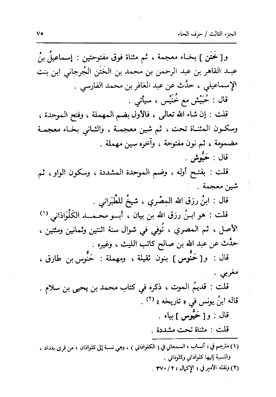 و [ختن] بخاء مُعْجمَة ثمَّ مثناة فَوق مفتوحتين: إِسْمَاعِيل بن عبد القاهر بن عبد الرَّحْمَن بن مُحَمَّد بن الختن الْجِرْجَانِيّ ابْن بنت الْإِسْمَاعِيلِيّ حدث عَن عبد الغافر بن مُحَمَّد الْفَارِسِي. قَالَ: حُبَيْش مَعَ خُنَيْس سَيَأْتِي. قلت: إِن شَاءَ الله تَعَالَى فَالْأول بِضَم الْمُهْملَة وَفتح الْمُوَحدَة وَسُكُون الْمُثَنَّاة تَحت ثمَّ شين مُعْجمَة وَالثَّانِي بخاء مُعْجمَة مَضْمُومَة ثمَّ نون مَفْتُوحَة وَآخره سين مُهْملَة. قَالَ: حبوش. قلت: بِفَتْح أَوله وَضم الْمُوَحدَة الْمُشَدّدَة وَسُكُون الْوَاو ثمَّ شين مُعْجمَة. قَالَ: ابْن رزق الله الْمصْرِيّ شيخ للطبراني. قلت: هُوَ ابْن رزق الله بن بَيَان أَبُو مُحَمَّد الكلواذاني الأَصْل ثمَّ الْمصْرِيّ توفّي فِي شَوَّال سنة اثْنَتَيْنِ وَثَمَانِينَ ومئتين حدث عَن عبد الله بن صَالح كَاتب اللَّيْث وَغَيره. قَالَ: و [حنوس] بنُون ثَقيلَة ومهملة: حنوس بن طَارق مغربي. قلت: قديم الْمَوْت ذكره فِي كتاب مُحَمَّد بن يحيى بن سَلام قَالَه ابْن يُونُس فِي تَارِيخه. قَالَ: و [حيوس] بياء. قلت: مثناة تَحت مُشَدّدَة.