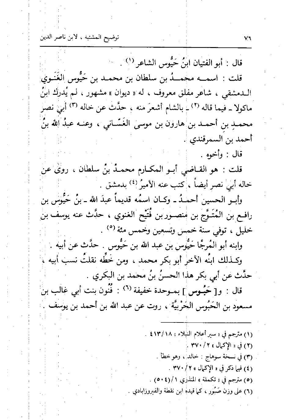 قَالَ: أَبُو الفتيان ابْن حيوس الشَّاعِر. قلت: اسْمه مُحَمَّد بن سُلْطَان بن مُحَمَّد بن حيوس الغنوي الدِّمَشْقِي شَاعِر مفلق مَعْرُوف لَهُ ديوَان مَشْهُور لم يدْرك ابْن مَاكُولَا - فِيمَا قَالَه - بِالشَّام أشعر مِنْهُ حدث عَن خَاله أبي نصر مُحَمَّد بن أَحْمد بن هَارُون بن مُوسَى الغساني وَعنهُ عبد الله بن أَحْمد بن السَّمرقَنْدِي. قَالَ: وَأَخُوهُ. قلت: هُوَ القَاضِي أَبُو المكارم مُحَمَّد بن سُلْطَان روى عَن خَاله أبي نصر أَيْضا كتب عَنهُ الْأَمِير بِدِمَشْق. وَأَبُو الْحُسَيْن أَحْمد - وَكَانَ اسْمه قَدِيما عبد الله - بن حيوس بن رَافع بن المتوج بن مَنْصُور بن فتيح الغنوي حدث عَنهُ يُوسُف بن خَلِيل توفّي سنة خمس وَتِسْعين وَخمْس مئة. وَابْنه أَبُو المرجا حيوس بن عبد الله بن حيوس. حدث عَن أَبِيه. وَكَذَلِكَ ابْنه الآخر أَبُو بكر مُحَمَّد وَمن خطه نقلت نسب أَبِيه حدث عَن أبي بكر هَذَا الْحسن بن مُحَمَّد بن الْبكْرِيّ. قَالَ: و [حبوس] بموحدة خَفِيفَة: فنون بنت أبي غَالب بن مَسْعُود بن الحبوس الحربية رَوَت عَن عبد الله بن أَحْمد بن يُوسُف.