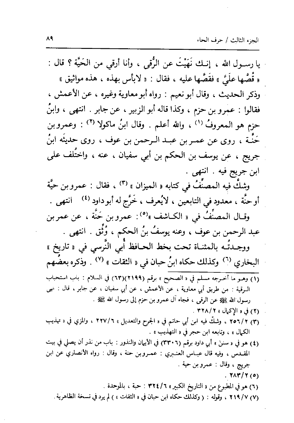 يَا رَسُول الله إِنَّك نهيت عَن الرقى وَأَنا أرقي من الْحَيَّة؟ قَالَ: قصها عَليّ فَقَصَّهَا عَلَيْهِ فَقَالَ: لَا بَأْس بِهَذِهِ هَذِه مواثيق وَذكر الحَدِيث وَقَالَ أَبُو نعيم: رَوَاهُ أَبُو مُعَاوِيَة وَغَيره عَن الْأَعْمَش فَقَالُوا: عَمْرو بن حزم وَكَذَا قَالَه أَبُو الزبير عَن جَابر. انْتهى وَابْن حزم هُوَ الْمَعْرُوف وَالله أعلم. وَقَالَ ابْن مَاكُولَا: وَعَمْرو بن حنة روى عَن عمر بن عبد الرَّحْمَن بن عَوْف روى حَدِيثه ابْن جريج عَن يُوسُف بن الحكم بن أبي سُفْيَان عَنهُ وَاخْتلف على ابْن جريج فِيهِ. انْتهى. وَشك فِيهِ المُصَنّف فِي كِتَابه الْمِيزَان فَقَالَ: عَمْرو بن حَيَّة أَو حنة مَعْدُود فِي التَّابِعين لَا يعرف خرج لَهُ أَبُو دَاوُد انْتهى. وَقَالَ المُصَنّف فِي الكاشف: عَمْرو بن حنة عَن عمر بن عبد الرَّحْمَن بن عَوْف وَعنهُ يُوسُف بن الحكم وثق. انْتهى. وَوَجَدته بِالْمُثَنَّاةِ تَحت بِخَط الْحَافِظ أبي النَّرْسِي فِي تَارِيخ البُخَارِيّ وَكَذَلِكَ حَكَاهُ ابْن حبَان فِي الثِّقَات. وَذكره بَعضهم