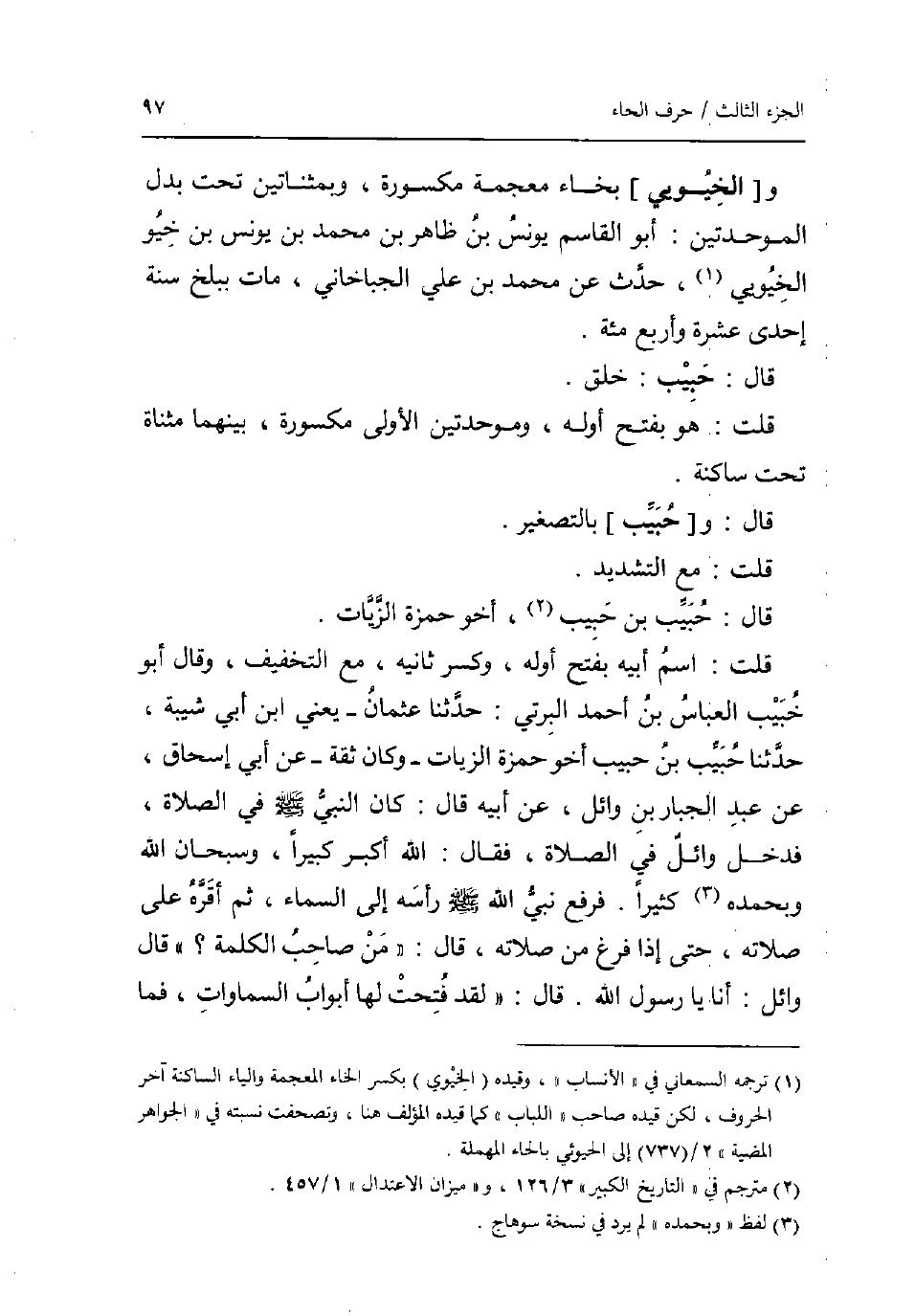 و [الخيوبي] بخاء مُعْجمَة مَكْسُورَة وبمثناتين تَحت بدل الموحدتين: أَبُو الْقَاسِم يُونُس بن ظَاهر بن مُحَمَّد بن يُونُس بن خيو الخيويي احدث عَن مُحَمَّد بن عَليّ الجباخاني مَاتَ ببلخ سنة إِحْدَى عشرَة وَأَرْبع مئة. قَالَ: حبيب: خلق. قلت: هُوَ بِفَتْح أَوله وموحدتين الأولى مَكْسُورَة بَينهمَا مثناة تَحت سَاكِنة. قَالَ: و [حبيب] بِالتَّصْغِيرِ. قلت: مَعَ التَّشْدِيد. قَالَ: حبيب بن حبيب أَخُو حَمْزَة الزيات. قلت: اسْم أَبِيه بِفَتْح أَوله وَكسر ثَانِيه مَعَ التَّخْفِيف وَقَالَ أَبُو خبيب الْعَبَّاس بن أَحْمد البرتي: حَدثنَا عُثْمَان _ يَعْنِي ابْن أبي شيبَة حَدثنَا حبيب بن حبيب أَخُو حَمْزَة الزيات _ وَكَانَ ثِقَة _ عَن أبي إِسْحَاق عَن عبد الْجَبَّار بن وَائِل عَن أَبِيه قَالَ: كَانَ النَّبِي صلى الله عَلَيْهِ وَسلم فِي الصَّلَاة فَدخل وَائِل فِي الصَّلَاة فَقَالَ: الله أكبر كَبِيرا وَسُبْحَان الله وَبِحَمْدِهِ كثيرا. فَرفع نَبِي الله صلى الله عَلَيْهِ وَسلم رَأسه إِلَى السَّمَاء ثمَّ أقره على صلَاته حَتَّى إِذا فرغ من صلَاته قَالَ: من صَاحب الْكَلِمَة؟ قَالَ وَائِل: أَنا يَا رَسُول الله. قَالَ: لقد فتحت لَهَا أَبْوَاب السَّمَاوَات فَمَا