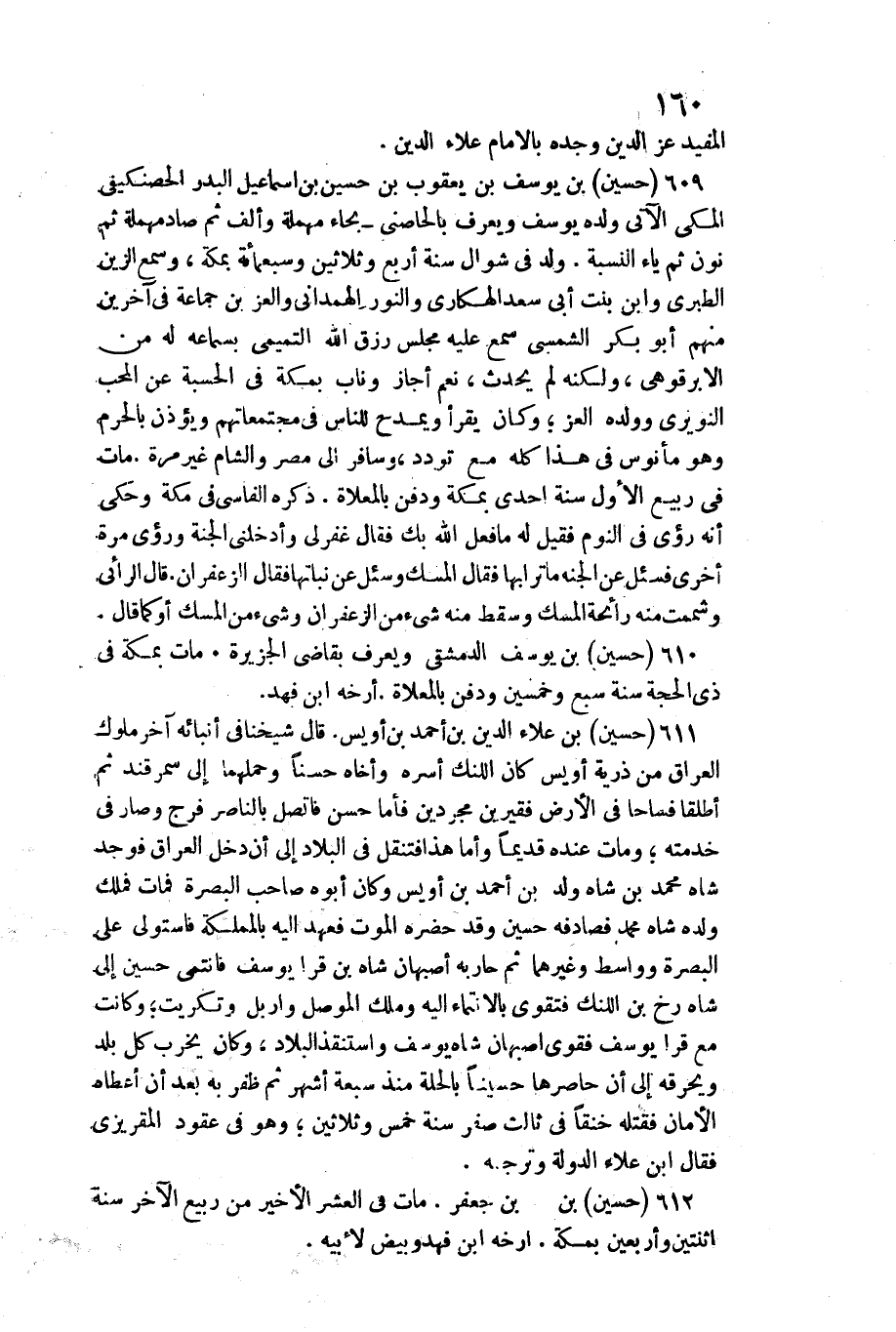 611 -. حُسَيْن بن عَلَاء الدّين بن أَحْمد بن أويس. / قَالَ شَيخنَا فِي أنبائه آخر مُلُوك الْعرَاق من ذُرِّيَّة أويس كَانَ اللنك أسره وأخاه حسنا وحملهما إِلَى سَمَرْقَنْد ثمَّ أطلقا فساحا فِي الأَرْض فقيرين مجردين فَأَما حسن فاتصل بالناصر فرج وَصَارَ فِي خدمته وَمَات عِنْده قَدِيما وَأما هَذَا فتنقل فِي الْبِلَاد إِلَى أَن دخل الْعرَاق فَوجدَ شاه مُحَمَّد بن شاه ولد بن أَحْمد بن أويس وَكَانَ أَبوهُ صَاحب الْبَصْرَة فَمَاتَ فَملك وَلَده شاه مُحَمَّد فصادفه حُسَيْن وَقد حَضَره الْمَوْت فعهد إِلَيْهِ بالمملكة فاستولى على الْبَصْرَة وواسط وَغَيرهمَا ثمَّ حاربه أَصْبَهَان شاه بن قرا يُوسُف فانتمى حُسَيْن إِلَى شاه رخ بن اللنك فتقوى بالانتماء إِلَيْهِ وَملك الْموصل واربل وتكريت وَكَانَت مَعَ قرا يُوسُف فقوى أَصْبَهَان شاه يُوسُف واستنقذ الْبِلَاد، وَكَانَ يخرب كل بلد ويحرقه إِلَى أَن حاصرها حُسَيْنًا بالحلة مُنْذُ سَبْعَة أشهر ثمَّ ظفر بِهِ بعد أَن أعطَاهُ الْأمان فَقتله خنقا فِي ثَالِث صفر سنة خمس وَثَلَاثِينَ وَهُوَ فِي عُقُود المقريزي فَقَالَ ابْن عَلَاء الدولة وترجمه.