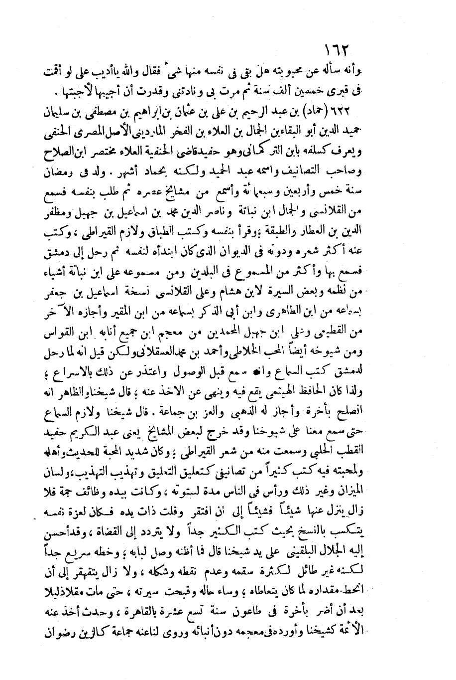 622 - حَمَّاد بن عبد الرَّحِيم بن عَليّ بن عُثْمَان بن إِبْرَاهِيم بن مصطفى بن سُلَيْمَان حميد الدّين أَبُو الْبَقَاء بن الْجمال بن الْعلَا بن الْفَخر المارديني الأَصْل الْمصْرِيّ الْحَنَفِيّ وَيعرف كسلفه بِابْن التركماني / وَهُوَ حفيد قَاضِي الْحَنَفِيَّة الْعَلَاء مُخْتَصر ابْن الصّلاح وَصَاحب التصانيف واسْمه عبد الحميد وَلكنه بحماد أشهر. ولد فِي رَمَضَان سنة خمس وَأَرْبَعين وَسَبْعمائة وأسمع من مَشَايِخ عصره ثمَّ طلب بِنَفسِهِ فَسمع من القلانسي وَالْجمال ابْن نباتة وناصر الدّين مُحَمَّد بن إِسْمَاعِيل بن جهبل ومظفر الدّين بن الْعَطَّار والطبقة وَقَرَأَ بِنَفسِهِ وَكتب الطباق ولازم القيراطي، وَكتب عَنهُ أَكثر شعره ودونه فِي الدِّيوَان الَّذِي كَانَ ابتدأه لنَفسِهِ ثمَّ رَحل إِلَى دمشق فَسمع بهَا وَأكْثر من المسموع فِي البلدين وَمن مسموعه على ابْن نباتة أَشْيَاء من نظمه وَبَعض السِّيرَة لِابْنِ هِشَام وَعلي القلانسي نُسْخَة إِسْمَاعِيل بن جَعْفَر بِسَمَاعِهِ من ابْن الطاهري وَابْن أبي الذّكر بِسَمَاعِهِ من ابْن المقير وَأَجَازَهُ الآخر من الْقطيعِي وَعلي ابْن جهبل المحمدين من مُعْجم ابْن جَمِيع أنابه ابْن القواس وَمن شُيُوخه أَيْضا الْمُحب الخلاطي وَأحمد بن مُحَمَّد الْعَسْقَلَانِي وَلَكِن قيل إِنَّه لما رَحل لدمشق كتب السماع وَأَنه سمع قبل الْوُصُول وَاعْتذر عَن)
