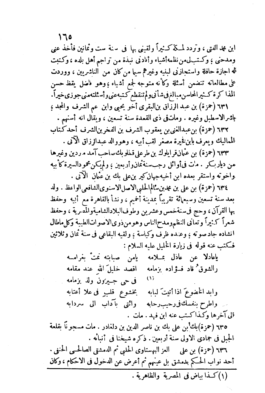 634 -. حَمْزَة بن عَليّ بن مُحَمَّد بن سَالم الْحلَبِي الأَصْل الاسنوي الشَّافِعِي الْوَاعِظ. / ولد بعد سنة تسعين وَسَبْعمائة تَقْرِيبًا بِمَدِينَة أخميم، وَنَشَأ بِالْقَاهِرَةِ مَعَ أَبِيه وَحفظ بهَا الْقُرْآن، وَحج فِي سنة خمس وَعشْرين وطوف الْبِلَاد الشامية والمصرية، وَحفظ شعرًا كثيرا وتعاني النّظم ومدح النَّاس وَهُوَ من ذَوي الْأَصْوَات الطّيبَة وكل مَا طَال انشاده جاد صَوته وَعِنْده ظرف وكياسة ولقيه البقاعي فِي سنة ثَمَان وَثَلَاثِينَ فَكتب عَنهُ قَوْله فِي زِيَارَة الْخَلِيل عَلَيْهِ السَّلَام: