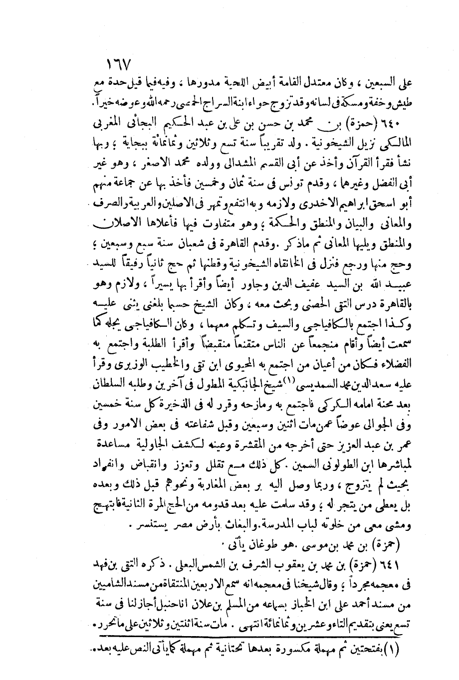 640 - حَمْزَة بن مُحَمَّد بن حسن بن عَليّ بن عبد الْحَكِيم البجائي المغربي الْمَالِكِي نزيل الشيخونية. / ولد تَقْرِيبًا سنة تسع وَثَلَاثِينَ وَثَمَانمِائَة ببجاية وَبهَا نَشأ فَقَرَأَ الْقُرْآن وَأخذ عَن أبي الْقسم المشدالي وَولده مُحَمَّد الْأَصْغَر، وَهُوَ نمير أبي الْفضل وَغَيرهمَا، وَقد تونس فِي سنة ثَمَان وَخمسين فَأخذ بهَا عَن جمَاعَة مِنْهُم أَبُو اسحق إِبْرَاهِيم الاخدري ولازمه وَبِه انْتفع وتمهر فِي الْأَصْلَيْنِ والعربية وَالصرْف والمعاني وَالْبَيَان والمنطق وَالْحكمَة وَهُوَ متفاوت فِيهَا)