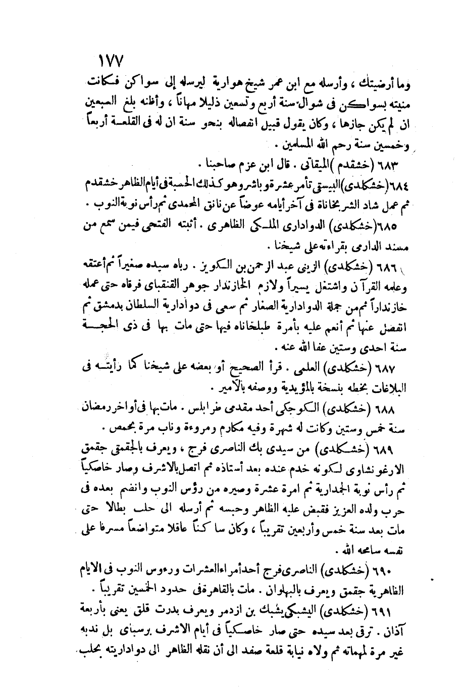 691 - خشكلدي اليشبكي يشبك بن ازدمر وَيعرف بدرت قلق يَعْنِي بأَرْبعَة آذان. / ترقى بعد سَيّده حَتَّى صَار خاصكيا فِي أَيَّام الاشرف برسباي بل نَدبه غير مرّة لمهماته ثمَّ ولاه نِيَابَة قلعة صفد إِلَى أَن نَقله الظَّاهِر إِلَى دواداريته بحلب