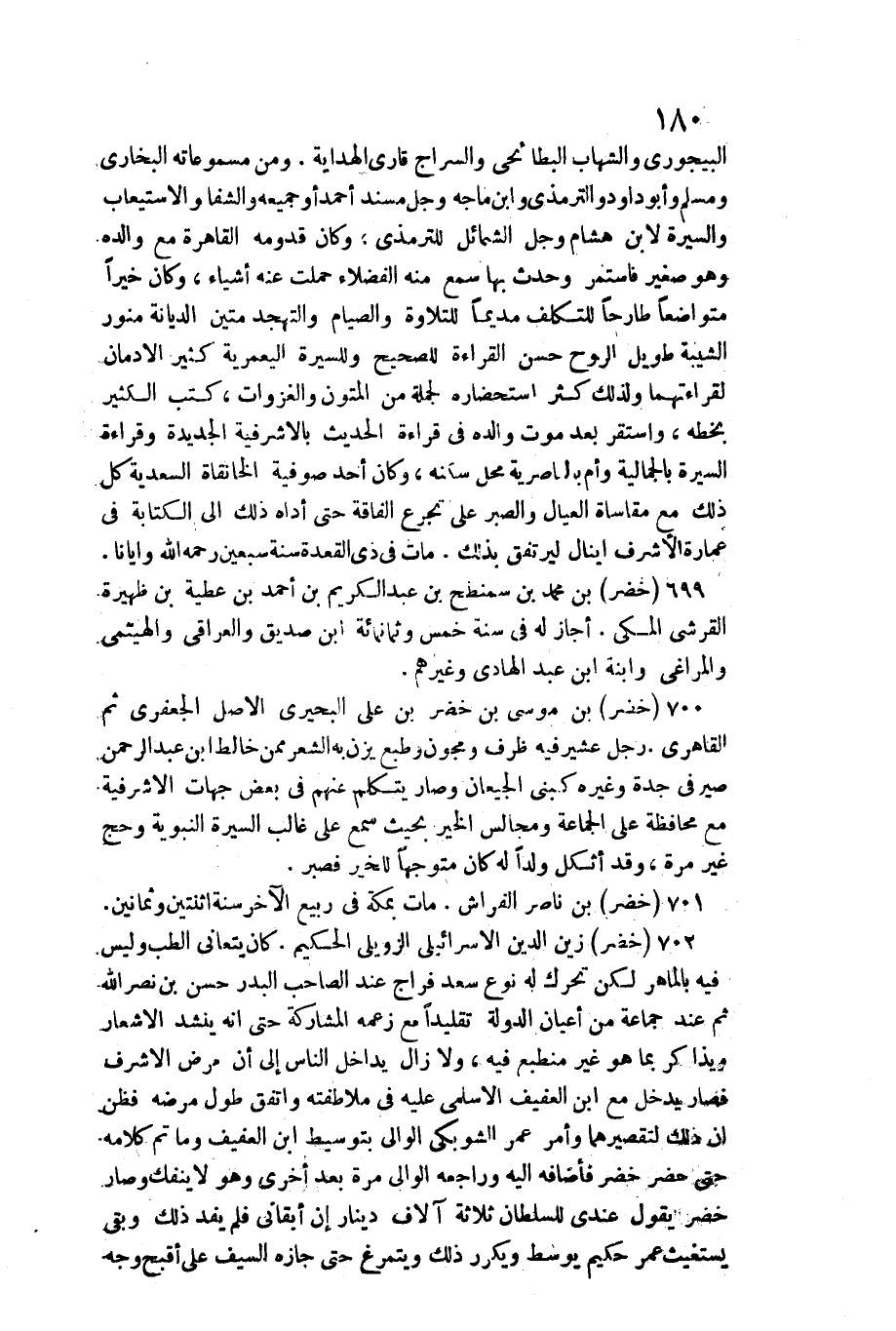 700 - خضر بن مُوسَى بن خضر بن عَليّ الْبُحَيْرِي الأَصْل الْجَعْفَرِي ثمَّ القاهري. / رجل عشير فِيهِ ظرف ومجون وطبع يزن بِهِ الشّعْر مِمَّن خالط ابْن عبد الرَّحْمَن صيرفي جدة وَغَيره كبني الجيعان وَصَارَ يتَكَلَّم عَنْهُم فِي بعض جِهَات الأشرفية مَعَ مُحَافظَة على الْجَمَاعَة ومجالس الْخَيْر بِحَيْثُ سمع على غَالب السِّيرَة النَّبَوِيَّة وَحج غير مرّة، وَقد أثكل ولدا لَهُ كَانَ مُتَوَجها للخير فَصَبر.