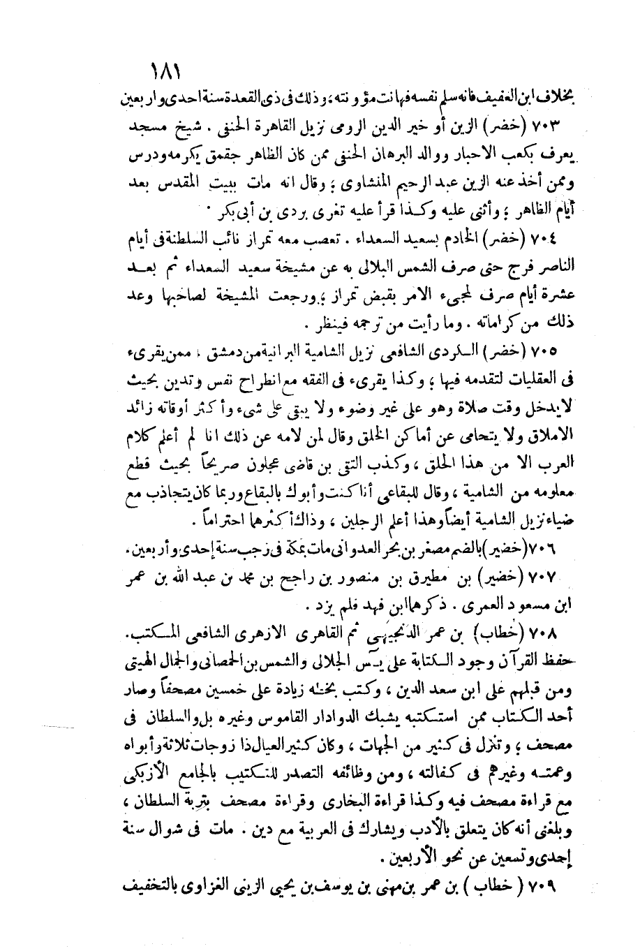 705 - خضر الْكرْدِي الشَّافِعِي نزيل الشامية البرانية من دمشق /. مِمَّن يقرىء فِي العقليات لتقدمه فِيهَا وَكَذَا يقرىء فِي الْفِقْه مَعَ انطراح نفس وَتَدين بِحَيْثُ لَا يدْخل وَقت صَلَاة وَهُوَ على غير وضوء وَلَا يبْقى على شَيْء وَأكْثر أوقاته زَائِد الاملاق وَلَا يتحامى عَن أَمَاكِن الْخلق وَقَالَ لمن لامه عَن ذَلِك أَنا لم أعلم كَلَام الْعَرَب إِلَّا من هَذَا الْحلق، وَكذب التقي بن قَاضِي عجلون صَرِيحًا بِحَيْثُ قطع معلومه من الشامية، وَقَالَ للبقاعي أَنا كنت وَأَبُوك بالبقاع وَرُبمَا كَانَ يتجاذب مَعَ ضِيَاء نزيل الشامية أَيْضا وَهَذَا أعلم الرجلَيْن، وَذَاكَ أكثرهما احتراما.