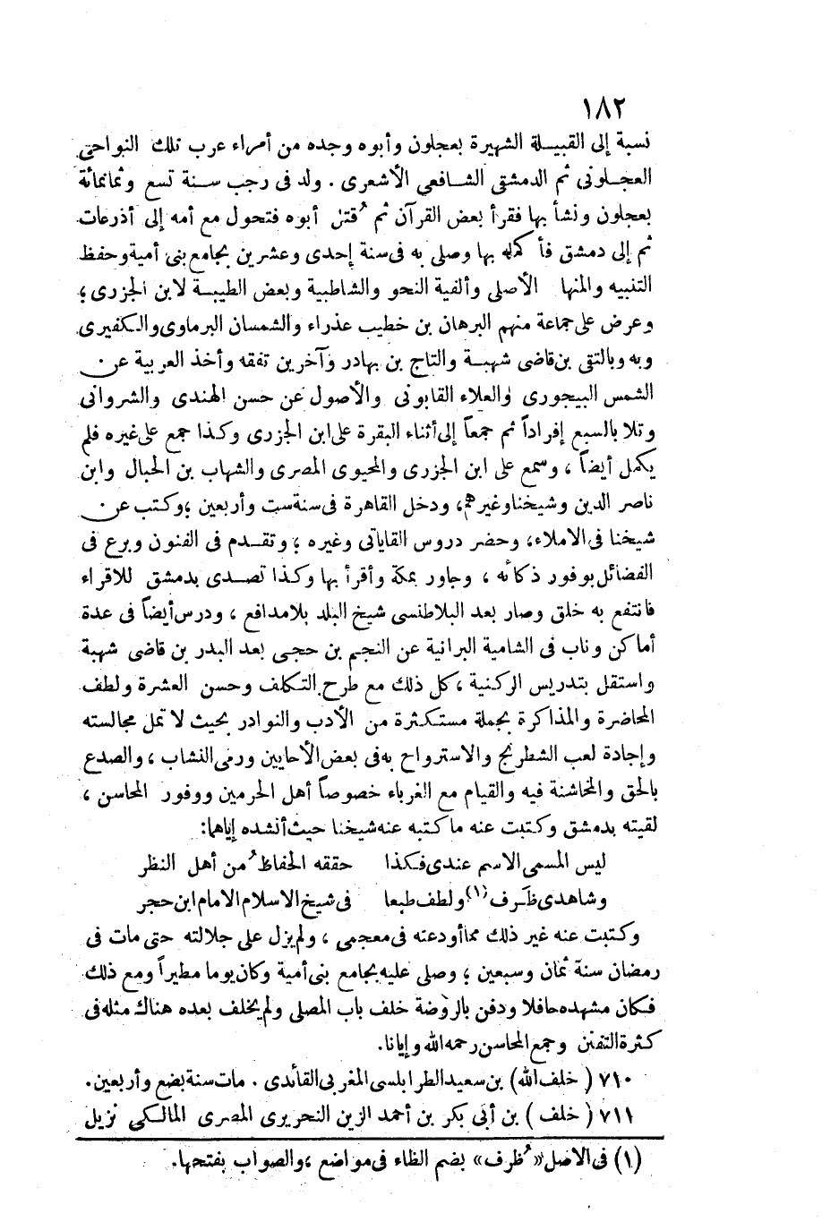 الشَّافِعِي الْأَشْعَرِيّ ولد فِي رَجَب سنة تسع وَثَمَانمِائَة بعجلون وَنَشَأ بهَا فَقَرَأَ بعض الْقُرْآن ثمَّ قتل أَبوهُ فتحول مَعَ أمه إِلَى أَذْرُعَات ثمَّ إِلَى دمشق فأكمله بهَا وَصلى بِهِ فِي سنة إِحْدَى وَعشْرين بِجَامِع بني أُميَّة وَحفظ التَّنْبِيه والمنها الْأَصْلِيّ وألفية النَّحْو والشاطبية وَبَعض الطّيبَة لِابْنِ الْجَزرِي وَعرض على جمَاعَة مِنْهُم الْبُرْهَان بن خطيب عذراء والشمسان الْبرمَاوِيّ والكفيري وَبِه وبالتقي بن قَاضِي شُهْبَة والتاج بن بهادر وَآخَرين تفقه وَأخذ الْعَرَبيَّة عَن الشَّمْس البيجوري والْعَلَاء القابوني وَالْأُصُول عَن حسن الْهِنْدِيّ والشرواني وتلا بالسبع إفرادا ثمَّ جمعا إِلَى أثْنَاء الْبَقَرَة على ابْن الْجَزرِي وَكَذَا جمع على غَيره فَلم يكمل أَيْضا، وَسمع على ابْن الْجَزرِي والمحيوي الْمصْرِيّ والشهاب بن الحبال وَابْن نَاصِر الدّين وَشَيخنَا وَغَيرهم، وَدخل الْقَاهِرَة فِي سنة سِتّ وَأَرْبَعين، وَكتب عَن شَيخنَا فِي الاملاء، وَحضر دروس القاياتي وَغَيره وَتقدم فِي الْفُنُون وبرع فِي الْفَضَائِل بوفور ذكائه، وجاور بِمَكَّة وأقرأ بهَا وَكَذَا تصدى بِدِمَشْق للاقراء فَانْتَفع بِهِ خلق وَصَارَ بعد البلاطنسي شيخ الْبَلَد بِلَاد مدافع، ودرس أَيْضا فِي عدَّة أَمَاكِن وناب فِي الشامية البرانية عَن النَّجْم بن حجي بعد الْبَدْر بن قَاضِي شُهْبَة واستقل بتدريس الركنية، كل ذَلِك مَعَ طرح التَّكَلُّف وَحسن الْعشْرَة ولطف المحاضرة والمذاكرة بجملة مستكثرة من الْأَدَب والنوادر بِحَيْثُ لَا تمل مُجَالَسَته وإجادة لعب الشطرنج والاسترواح بِهِ فِي بعض الْأَحَايِين وَرمى النشاب، والصدع بِالْحَقِّ والمخاشنة فِيهِ وَالْقِيَام مَعَ الغرباء خُصُوصا أهل الْحَرَمَيْنِ ووفور المحاسن، لَقيته بِدِمَشْق وكتبت عَنهُ مَا كتبه عَنهُ شَيخنَا حَيْثُ أنْشدهُ إيَّاهُمَا: