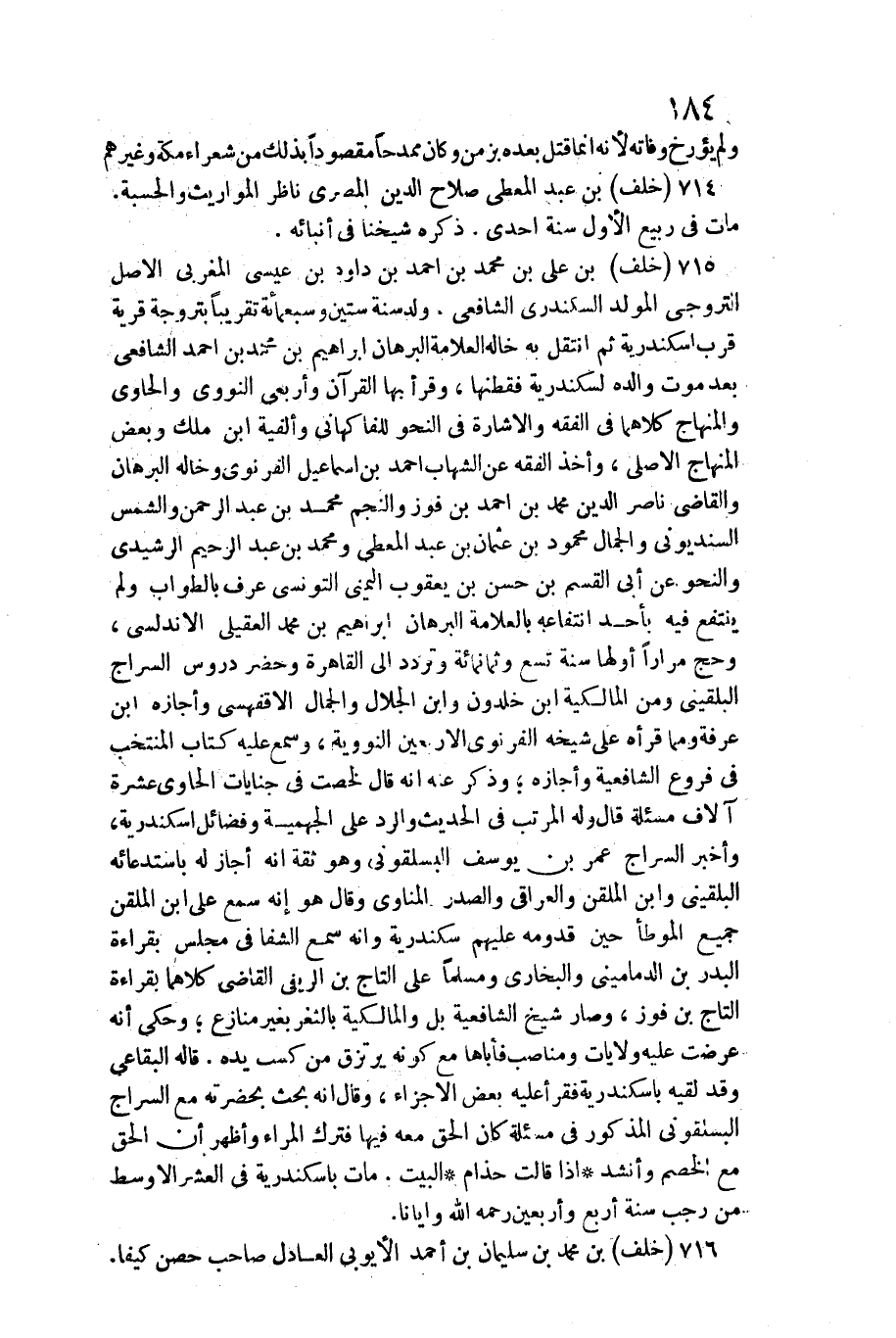 715 - خلف بن عَليّ بن مُحَمَّد بن أَحْمد بن دَاوُد بن عِيسَى المغربي الأَصْل التروجي المولد السكندري الشَّافِعِي. / ولد سنة سِتِّينَ وَسَبْعمائة تَقْرِيبًا بتروجة قَرْيَة قرب اسكندرية ثمَّ انْتقل بِهِ خَاله الْعَلامَة الْبُرْهَان إِبْرَاهِيم بن مُحَمَّد بن أَحْمد الشَّافِعِي بعد موت وَالِده لسكندرية فقطنها، وَقَرَأَ بهَا الْقُرْآن وأربعي النَّوَوِيّ وَالْحَاوِي والمنهاج كلاها فِي الْفِقْه والاشارة فِي النَّحْو للفاكهاني وألفية ابْن ملك وَبَعض الْمِنْهَاج الْأَصْلِيّ، وَأخذ الْفِقْه عَن الشهَاب أَحْمد بن إِسْمَاعِيل الفرنوي وخاله الْبُرْهَان وَالْقَاضِي نَاصِر الدّين مُحَمَّد بن أَحْمد بن فوز والنجم مُحَمَّد بن عبد الرَّحْمَن وَالشَّمْس السنديوني وَالْجمال مَحْمُود بن عُثْمَان بن عبد الْمُعْطِي وَمُحَمّد بن عبد الرَّحِيم الرَّشِيدِيّ والنحو عَن أبي الْقسم بن حسن بن يَعْقُوب اليمني التّونسِيّ عرف بالطواب وَلم ينْتَفع فِيهِ بِأحد انتفاعه بالعلامة الْبُرْهَان إِبْرَاهِيم بن مُحَمَّد الْعقيلِيّ الأندلسي، وَحج مرَارًا أَولهَا سنة تسع وَثَمَانمِائَة وَتردد إِلَى الْقَاهِرَة وَحضر دروس السراج البُلْقِينِيّ وَمن الْمَالِكِيَّة ابْن خلدون وَابْن الْجلَال وَالْجمال الاقفهسي وَأَجَازَهُ ابْن عرفه وَمِمَّا قَرَأَهُ على شَيْخه الفرنوي الْأَرْبَعين النووية، وَسمع عَلَيْهِ كتاب الْمُنْتَخب فِي فروع الشَّافِعِيَّة وَأَجَازَهُ وَذكر عَنهُ أَنه قَالَ لخصت فِي جنايات الْحَاوِي عشرَة آلَاف مسئلة قَالَ وَله الْمُرَتّب فِي الحَدِيث وَالرَّدّ على الْجَهْمِية وفضائل اسكندرية، وَأخْبر السراج عمر بن يُوسُف البسلقوني وَهُوَ ثِقَة أَنه أجَاز لَهُ باستدعائه البُلْقِينِيّ وَابْن الملقن والعراقي والصدر الْمَنَاوِيّ وَقَالَ هُوَ إِنَّه سمع على ابْن الملقن جَمِيع الْمُوَطَّأ حِين قدومه عَلَيْهِم سكندرية وَإنَّهُ سمع الشفا فِي مجْلِس بِقِرَاءَة الْبَدْر بن الدماميني وَالْبُخَارِيّ وَمُسلمًا على التَّاج بن الريفي القَاضِي كِلَاهُمَا بِقِرَاءَة التَّاج بن فوز، وَصَارَ شيخ الشَّافِعِيَّة بل والمالكية بالثغر بِغَيْر مُنَازع وَحكى أَنه عرضت عَلَيْهِ ولايات ومناصب فأباها مَعَ كَونه يرتزق من كسب يَده. قَالَه البقاعي وَقد لقِيه باسكندرية فَقَرَأَ عَلَيْهِ بعض الْأَجْزَاء، وَقَالَ إِنَّه بح بِحَضْرَتِهِ مَعَ السراج البسلقوني الْمَذْكُور فِي مسئلة كَانَ الْحق مَعَه فِيهَا فَترك المراء وَأظْهر أَن الْحق مَعَ الْخصم وَأنْشد إِذا قَالَت حذام الْبَيْت. مَاتَ باسكندرية فِي الْعشْر الْأَوْسَط من رَجَب سنة أَربع وَأَرْبَعين رَحمَه الله وإيانا.)