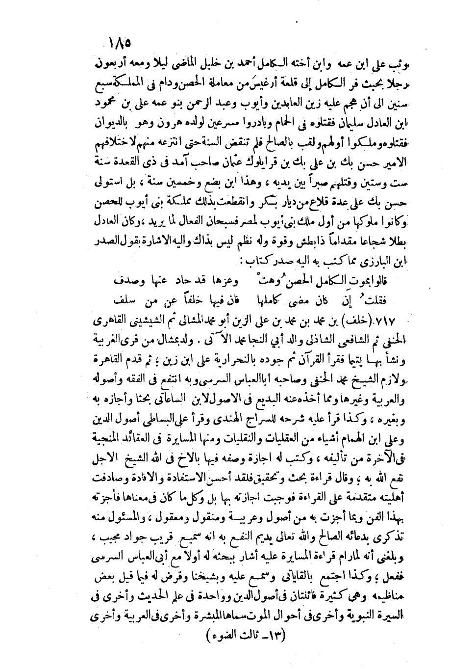 717 - خلف بن مُحَمَّد بن مُحَمَّد بن عَليّ الزين أَبُو مُحَمَّد المشالي ثمَّ الشيشيني القاهري الْحَنَفِيّ ثمَّ الشَّافِعِي الشاذلي وَالِد أبي النجا مُحَمَّد / الْآتِي. ولد بمشال من قرى الغربية وَنَشَأ بهَا يَتِيما فَقَرَأَ الْقُرْآن ثمَّ جوده بالنحرارية على ابْن زين ثمَّ قدم الْقَاهِرَة ولازم الشَّيْخ مُحَمَّد الْحَنَفِيّ وَصَاحبه أَبَا الْعَبَّاس السرسي وَبِه انْتفع فِي الْفِقْه وأصوله والعربية وَغَيرهَا وَمِمَّا أَخذه عَنهُ البديع فِي الْأُصُول لِابْنِ الساعاتي بحثا وَأَجَازَهُ بِهِ وَبِغَيْرِهِ، وَكَذَا قَرَأَ عَلَيْهِ شَرحه للسراج الْهِنْدِيّ وَقَرَأَ على البسطامي أصُول الدّين وعَلى ابْن الْهمام أَشْيَاء من العقليات والنقليات وَمِنْهَا المسايرة فِي العقائد المنجية فِي الْآخِرَة من تأليفه، وَكتب لَهُ إجَازَة وَصفه فِيهَا بالأخ فِي الله الشَّيْخ الْأَجَل نفع الله بِهِ وَقَالَ قِرَاءَة بحث وَتَحْقِيق فَلَقَد أحسن الاستفادة والافادة وصادفت أَهْلِيَّته مُتَقَدّمَة على الْقِرَاءَة فَوَجَبت إِجَازَته بهَا بل وكل مَا كَانَ فِي مَعْنَاهَا فأجزته بِهَذَا الْفَنّ وَبِمَا أجزت بِهِ من أصُول وعربية ومنقول ومعقول، والمسئول مِنْهُ تذكرى بدعائه الصَّالح وَالله تَعَالَى يديم النَّفْع بِهِ إِنَّه سميع قريب جواد مُجيب، وَبَلغنِي أَنه لما رام قِرَاءَة المسايرة عَلَيْهِ أَشَارَ ببحثه لَهُ أَولا مَعَ أبي الْعَبَّاس السرسي فَفعل وَكَذَا اجْتمع بالقاياتي وَسمع عَلَيْهِ وبشيخنا وقرض لَهُ فِيمَا قيل بعض مناظيمه وَهِي كَثِيرَة فاثنتان فِي أصُول الدّين وَوَاحِدَة فِي علم)