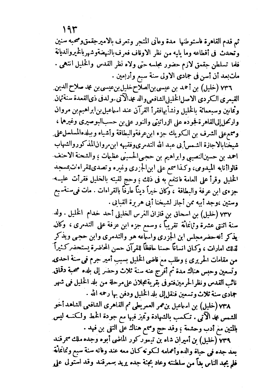 738 - خَلِيل بن إِسْمَاعِيل بن عمر العمريطي ثمَّ القاهري الشَّافِعِي الشَّاهِد أَخُو الشَّمْس مُحَمَّد / الْآتِي. تكسب بِالشَّهَادَةِ وتميز فِيهَا مَعَ جودة الْخط وَلكنه لَيْسَ بالمتين مَعَ أدب وحشمة وَقد حج وَسمع هُنَاكَ على التقي بن فَهد.