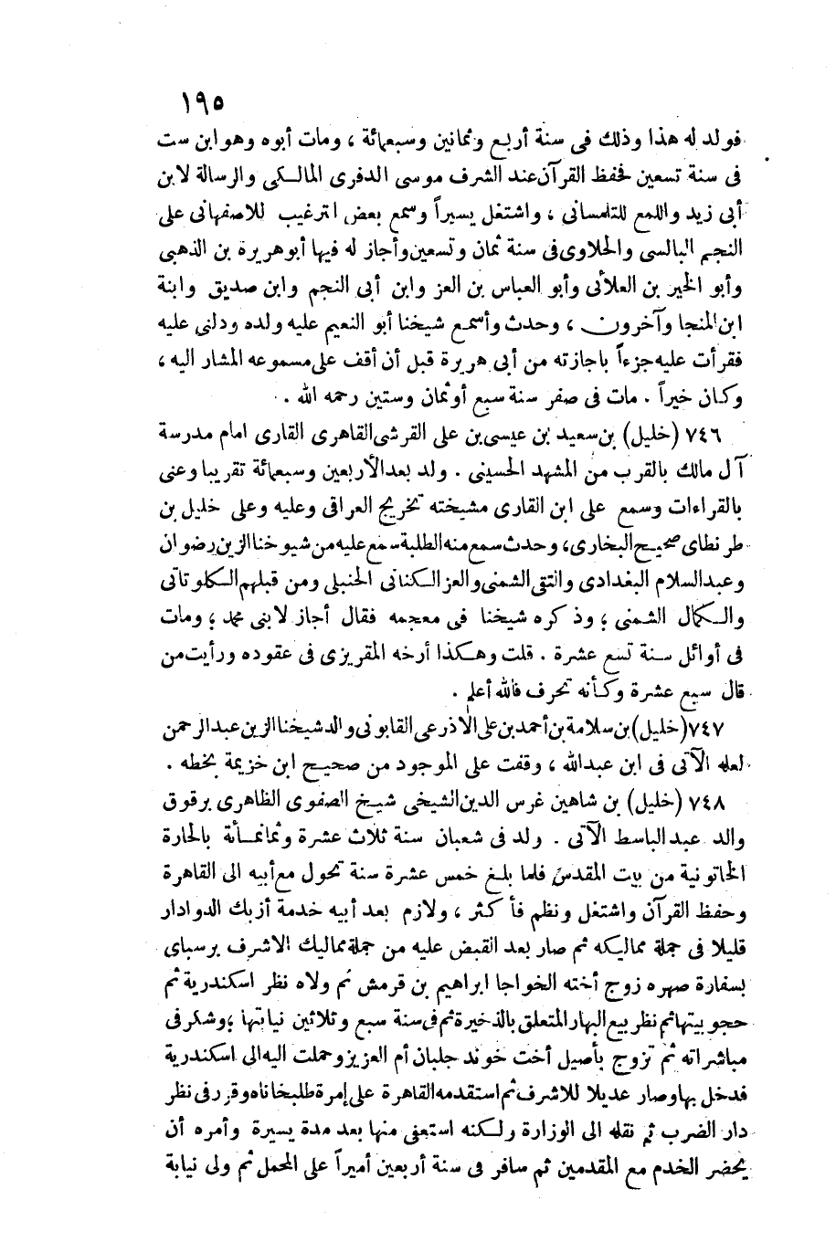 746 - خَلِيل بن سعد بن عِيسَى بن عَليّ الْقرشِي القاهري الْقَارِي / امام مدرسة آل مَالك بِالْقربِ من المشهد الْحُسَيْنِي. ولد بعد الْأَرْبَعين وَسَبْعمائة تَقْرِيبًا وعني بالقراءات وَسمع على ابْن الْقَارِي مشيخته تَخْرِيج الْعِرَاقِيّ وَعَلِيهِ وعَلى خَلِيل بن طرنطاي صَحِيح البُخَارِيّ، وَحدث سمع مِنْهُ الطّلبَة سمع عَلَيْهِ من شُيُوخنَا الزين رضوَان وَعبد السَّلَام الْبَغْدَادِيّ والتقي الشمني والعز الْكِنَانِي الْحَنْبَلِيّ وَمن قبلهم الكلوتاتي والكمال الشمني وَذكره شَيخنَا فِي مُعْجَمه فَقَالَ أجَاز لِابْني مُحَمَّد وَمَات فِي أَوَائِل سنة تسع عشرَة. قلت وَهَكَذَا أرخه المقريزي فِي عقوده وَرَأَيْت من قَالَ سبع عشرَة وَكَأَنَّهُ تحرف فَالله أعلم.
