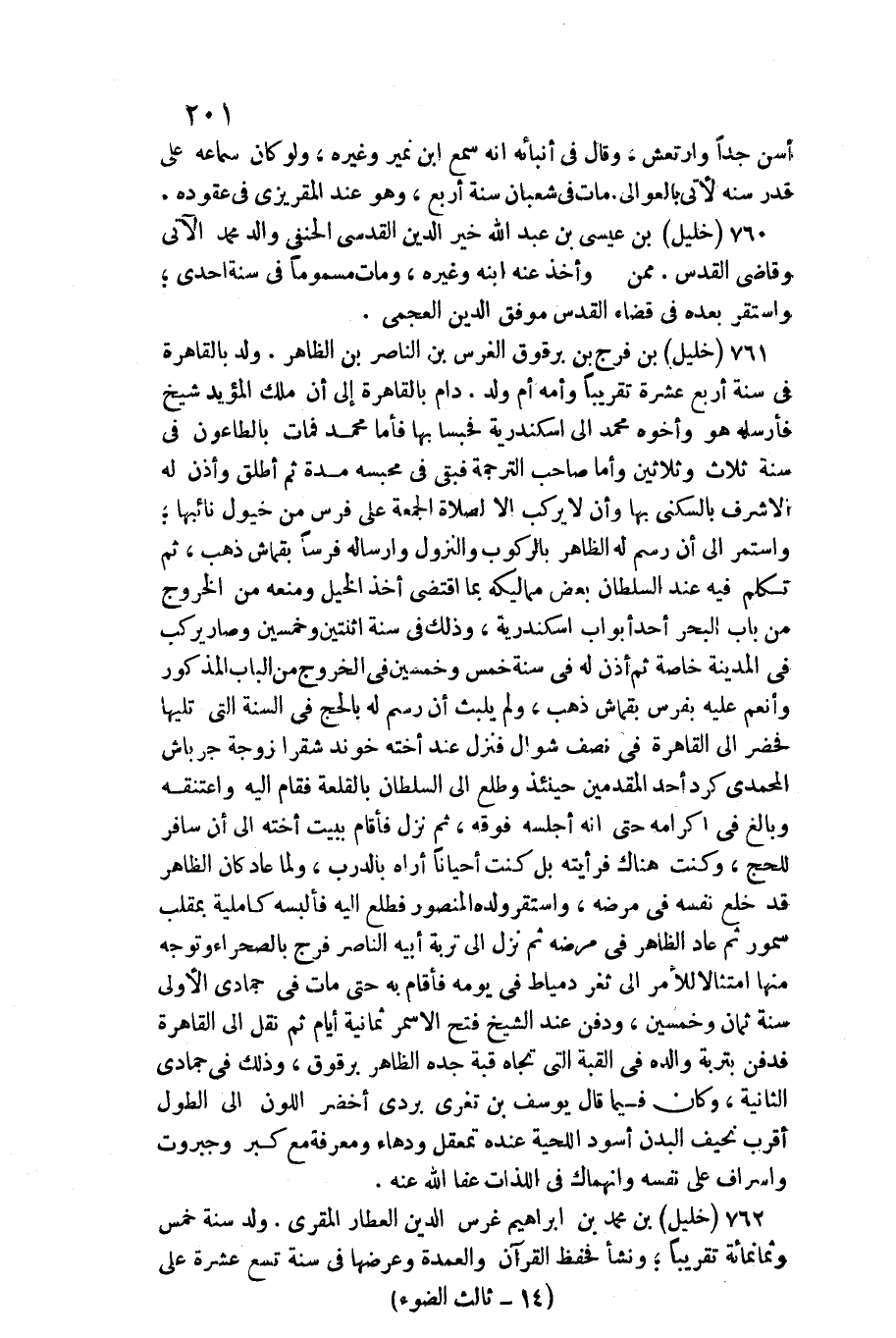 761 - خَلِيل بن فرج بن برقوق الْغَرْس بن النَّاصِر بن الظَّاهِر /. ولد بِالْقَاهِرَةِ فِي سنة أَربع عشرَة تَقْرِيبًا وَأمه أم ولد. دَامَ بِالْقَاهِرَةِ إِلَى أَن ملك الْمُؤَيد شيخ فَأرْسلهُ هُوَ وَأَخُوهُ مُحَمَّد إِلَى اسكندرية فحبسا بهَا فَأَما مُحَمَّد فَمَاتَ بالطاعون فِي سنة ثَلَاث وَثَلَاثِينَ وَأما صَاحب التَّرْجَمَة فَبَقيَ فِي محبسه مُدَّة ثمَّ أطلق وَأذن لَهُ الْأَشْرَف بِالسُّكْنَى بهَا وَأَن لَا يركب إِلَّا لصَلَاة الْجُمُعَة على فرس من خُيُول نائبها وَاسْتمرّ إِلَى أَن رسم لَهُ الظَّاهِر بالركوب وَالنُّزُول وارساله فرسا بقماش ذهب، ثمَّ تكلم فِيهِ عِنْد السُّلْطَان بعض مماليكه بِمَا اقْتضى أَخذ الْخَلِيل وَمنعه من الْخُرُوج من بَاب الْبَحْر أحد أَبْوَاب اسكندرية، وَذَلِكَ فِي سنة اثْنَتَيْنِ وَخمسين وَصَارَ يركب فِي الْمَدِينَة خَاصَّة ثمَّ أذن لَهُ فِي سنة خمس وَخمسين فِي الْخُرُوج من الْبَاب الْمَذْكُور وأنعم عَلَيْهِ بفرس بقماش ذهب، وَلم يلبث أَن رسم لَهُ بِالْحَجِّ فِي السّنة الَّتِي تَلِيهَا فَحَضَرَ إِلَى الْقَاهِرَة فِي نصف شَوَّال فَنزل عِنْد أُخْته خوند شقرا زَوْجَة جرباش المحمدي كرد أحد المقدمين حِينَئِذٍ وطلع إِلَى السُّلْطَان بالقلعة فَقَامَ إِلَيْهِ واعتنقه وَبَالغ فِي إكرامه حَتَّى إِنَّه أجلسه فَوْقه، ثمَّ نزل فَأَقَامَ بِبَيْت أُخْته إِلَى أَن سَافر لِلْحَجِّ، وَكنت هُنَاكَ فرأيته بل كنت أَحْيَانًا أرَاهُ بالدرب، وَلما عَاد كَانَ الظَّاهِر قد خلع نَفسه فِي مَرضه، وَاسْتقر وَلَده الْمَنْصُور فطلع إِلَيْهِ فألبسه كاملية بمقلب سمور ثمَّ عَاد الظَّاهِر فِي مَرضه ثمَّ نزل إِلَى تربة أَبِيه النَّاصِر فرج بالصحراء وَتوجه مِنْهَا امتثالا لِلْأَمْرِ إِلَى ثغر دمياط فِي يَوْمه فَأَقَامَ بِهِ حَتَّى مَاتَ فِي جُمَادَى الأولى سنة ثَمَان وَخمسين، وَدفن عِنْد الشَّيْخ فتح الأسمر ثَمَانِيَة أَيَّام ثمَّ نقل إِلَى الْقَاهِرَة فَدفن بتربة وَالِده فِي الْقبَّة الَّتِي تجاه قبَّة جده الظَّاهِر برقوق، وَذَلِكَ فِي جُمَادَى الثَّانِيَة، وَكَانَ فِيمَا قَالَ يُوسُف بن تغري بردى أَخْضَر اللَّوْن إِلَى الطول أقرب نحيف الْبدن أسود اللِّحْيَة عِنْده تمعقل ودهاء وَمَعْرِفَة مَعَ كبر وجبروت واسراف على نَفسه وانهماك فِي اللَّذَّات عَفا الله عَنهُ.