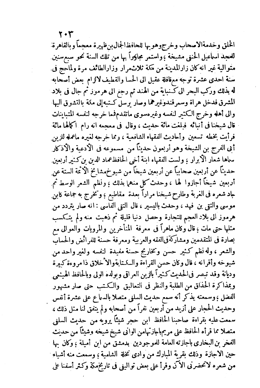 الْخلق وخدمة الاصحاب وَخرج وَهُوَ بهَا لِلْحَافِظِ الْجمال بن ظهيرة معجما وبالقاهرة للمجد إِسْمَاعِيل الْحَنَفِيّ مشيخة وَاسْتمرّ مجاورا بهَا من تِلْكَ السّنة نَحْو سبع سِنِين مُتَوَالِيَة غير أَنه كَانَ زار الْمَدِينَة من مَكَّة ثَلَاث مرار وزار الطَّائِف مرّة وَلما حج فِي سنة إِحْدَى عشرَة توجه مَعَ قافلة عقيل إِلَى الحسا والقطيف لالزام بعض أَصْحَابه لَهُ بذلك وَركب الْبَحْر إِلَى كنباية من الْهِنْد ثمَّ رَجَعَ إِلَى هرموز ثمَّ جال فِي بِلَاد الْمشرق فَدخل هراة وسمرقند وَغَيرهمَا وَصَارَ يُرْسل كتبه إِلَى مَكَّة بالتشوق إِلَيْهَا وَإِلَى أَهله وَخرج الْكثير لنَفسِهِ وَغَيره سوى مَا تقدم فمما خرجه لنَفسِهِ المتباينات قَالَ شَيخنَا فِي أنبائه فبلغت مائَة حَدِيث، وَقَالَ فِي مُعْجَمه أَنه رام إكمالها مائَة فَرَأَيْت بِخَطِّهِ تسعين وَأَحَادِيث الْفُقَهَاء الشَّافِعِيَّة، وَمِمَّا خرجه لغيره مَا عمله للزين أبي الْفرج بن الشيخة وَهُوَ أَرْبَعُونَ حَدِيثا من مسموعه فِي الْأَدْعِيَة والأذكار سَمَّاهَا شعار الْأَبْرَار وَلست الْفُقَهَاء ابْنة أخي الْحَافِظ عماد الدّين بن كثير أَرْبَعِينَ حَدِيثا عَن أَرْبَعِينَ صحابيا عَن أَرْبَعِينَ شَيخا من شُيُوخ مَشَايِخ الْأَئِمَّة السِّتَّة عَن أَرْبَعِينَ شَيخا أَجَازُوا لَهَا، وَحدث كل مِنْهُمَا بذلك ونظم الشّعْر الْوسط ثمَّ جاد شعره فِي الغربة وطارح شَيخنَا مرَارًا بعدة مقاطيع وَتخرج بِهِ جمَاعَة كَابْن مُوسَى والتقي بن فَهد، وَحدث باليسير، قَالَ التقي الفاسي: انه صَار يتَرَدَّد من هرموز إِلَى بِلَاد الْعَجم للتِّجَارَة وَحصل دنيا قَليلَة ثمَّ ذهبت مِنْهُ وَلم يتكسب مثلهَا حَتَّى مَاتَ قَالَ وَكَانَ ماهرا فِي معرفَة الْمُتَأَخِّرين والمرويات والعوالي مَعَ بصارة فِي الْمُتَقَدِّمين ومشاركة فِي الْفِقْه والعربية وَمَعْرِفَة حَسَنَة للفرائض والحساب وَالشعر، وَله نظم كثير حسن وتخاريج حَسَنَة مفيدة لنَفسِهِ ولغير وَاحِد من شُيُوخه وأقرانه، قَالَ وَكَانَ حسن الْقِرَاءَة وَالْكِتَابَة والأخلاق ذَا مُرُوءَة كَبِيرَة وديانة وَقد تبصر فِي الحَدِيث كثيرا بالزين الْعِرَاقِيّ وبولده الْوَلِيّ وبالحافظ الهيثمي وبمذاكرة الحذاق من الطّلبَة وَالنَّظَر فِي التَّعَالِيق والكتب حَتَّى صَار مَشْهُور الْفضل وسمعته يذكر أَنه سمع حَدِيث السلَفِي مُتَّصِلا بِالسَّمَاعِ على عشرَة أنفس وَحَدِيث الحجار على أَزِيد من أَرْبَعِينَ نَفرا من أَصْحَابه وَلم يتَّفق لنا مثل ذَلِك، سَمِعت عَلَيْهِ بِقِرَاءَة صاحبنا الْحَافِظ ابْن حجر شَيْئا يرويهِ من حَدِيث السلَفِي مُتَّصِلا مِمَّا قَرَأَهُ الْحَافِظ على مَرْيَم بإجازتها من الواني شيخ شَيْخه وشيئا من حَدِيث الْفَخر بن البُخَارِيّ بإجازته الْعَامَّة للموجودين بِدِمَشْق من ابْن أميلة وَكَانَ بهَا حِين الاجازة وَذَلِكَ بقرية الْمُبَارك من وَادي نَخْلَة الشامية وَسمعت مِنْهُ أَشْيَاء)