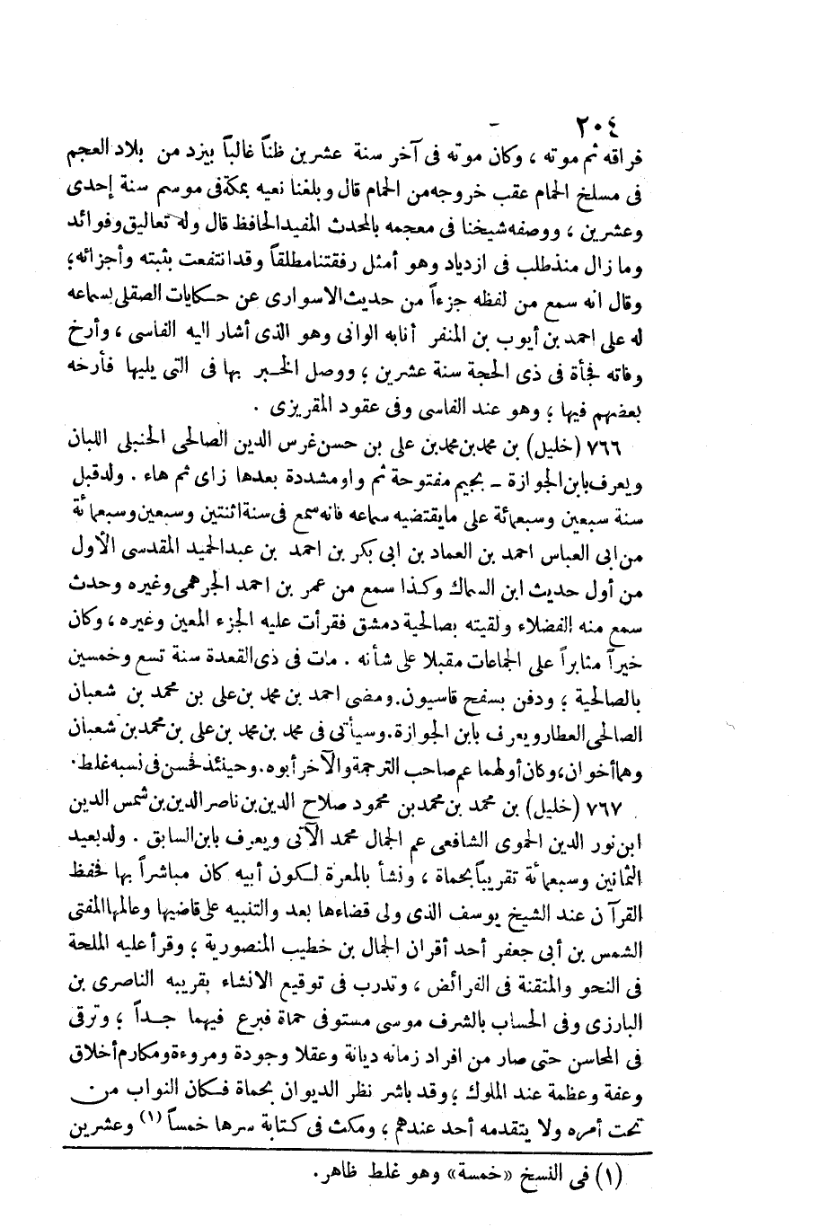 767 - خَلِيل بن مُحَمَّد بن مُحَمَّد بن مَحْمُود صَلَاح الدّين بن نَاصِر الدّين بن شمس الدّين ابْن نور الدّين الْحَمَوِيّ الشَّافِعِي عَم الْجمال مُحَمَّد / الْآتِي وَيعرف بِابْن السَّابِق. ولد بعيد الثَّمَانِينَ وَسَبْعمائة تَقْرِيبًا بحماة، وَنَشَأ بالمعرة لكَون أَبِيه كَانَ مباشرا بهَا فحفظ الْقُرْآن عِنْد الشَّيْخ يُوسُف الَّذِي ولي قضاءها بعد والتنبيه على قاضيها وعالمها الملحة فِي النَّحْو والمتقنة فِي الْفَرَائِض، وتدرب فِي توقيع الانشاء بقريبه الناصري بن الْبَارِزِيّ وَفِي الْحساب بالشرف مُوسَى مُسْتَوْفِي حماة فبرع فيهمَا جدا وترقى فِي المحاسن حَتَّى صَار من أَفْرَاد زَمَانه ديانَة وعقلا وجودة ومروءة وَمَكَارِم أَخْلَاق وعفة وعظمة عِنْد الْمُلُوك وَقد بَاشر نظر الدِّيوَان بحماة فَكَانَ النواب من تَحت أمره وَلَا يتقدمه أحد عِنْدهم وَمكث فِي كِتَابَة سرها خمْسا وَعشْرين
