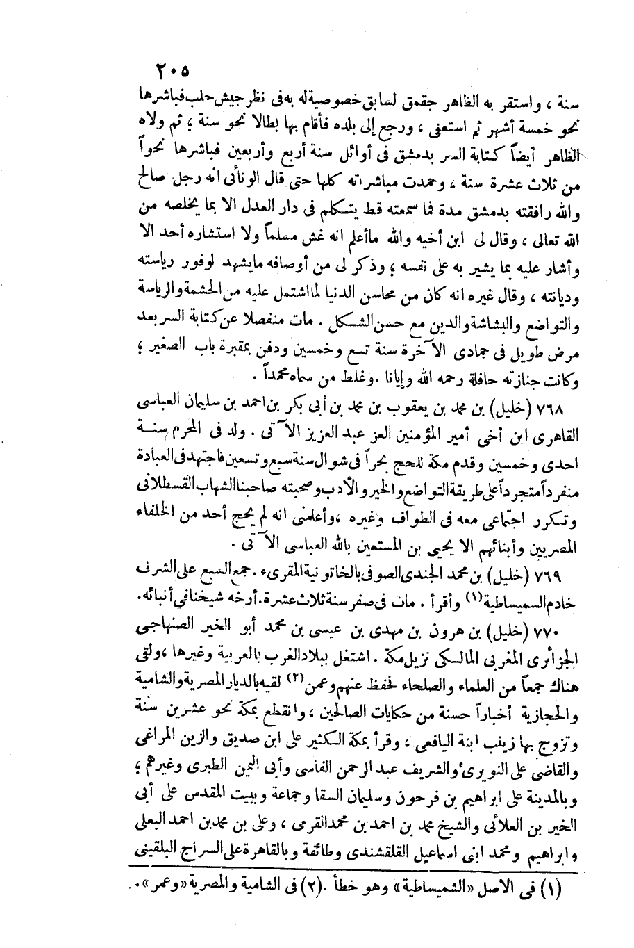 768 - خَلِيل بن مُحَمَّد بن يَعْقُوب بن مُحَمَّد بن أبي بكر بن أَحْمد بن سُلَيْمَان العباسي القاهري ابْن أخي أَمِير الْمُؤمنِينَ الْعِزّ عبد الْعَزِيز / الْآتِي. ولد فِي الْمحرم سنة إِحْدَى وَخمسين وَقدم مَكَّة لِلْحَجِّ بحرا فِي شَوَّال سنة سبع وَتِسْعين فاجتهد فِي الْعِبَادَة مُنْفَردا متجردا على طَريقَة التَّوَاضُع وَالْخَيْر وَالْأَدب وصحبته صاحبنا الشهَاب الْقُسْطَلَانِيّ وتكرر اجتماعي مَعَه فِي الطّواف وَغَيره، وأعلمني أَنه لم يحجّ أحد من الْخُلَفَاء المصريين وَأَبْنَائِهِمْ إِلَّا يحيى بن المستعين بِاللَّه العباسي الْآتِي