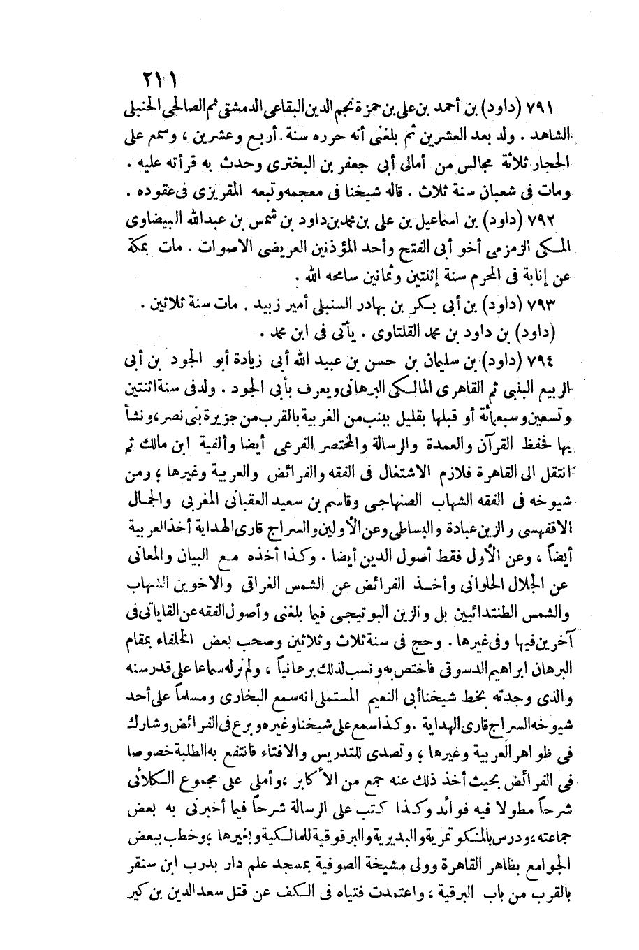 791 - دَاوُد بن أَحْمد بن عَليّ بن حَمْزَة نجم الدّين البقاعي الدِّمَشْقِي ثمَّ الصَّالِحِي الْحَنْبَلِيّ الشَّاهِد. / ولد بعد الْعشْرين ثمَّ بَلغنِي أَنه حَرَّره سنة أَربع وَعشْرين، وَسمع على الْحجاز ثَلَاثَة مجَالِس من أمالي أبي جَعْفَر بن البخْترِي وَحدث بِهِ قرأته عَلَيْهِ. وَمَات فِي شعْبَان سنة ثَلَاث. قَالَه شَيخنَا فِي مُعْجَمه وَتَبعهُ المقريزي فِي عقوده.