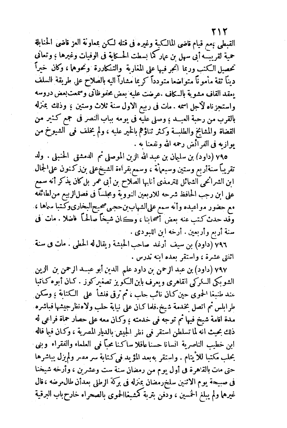 795 -. دَاوُد بن سُلَيْمَان بن عبد الله الزين الْموصِلِي ثمَّ الدِّمَشْقِي الْحَنْبَلِيّ /. ولد تَقْرِيبًا سنة أَربع وَسِتِّينَ وَسَبْعمائة، وَسمع بِقِرَاءَة الشَّيْخ عَليّ بن زكنون على الْجمال ابْن الشرائحي الشَّمَائِل لِلتِّرْمِذِي أنابها الصّلاح بن أبي عمر بل كَانَ يذكر أَنه سمع على ابْن رَجَب الْحَافِظ شَرحه للاربعين النووية ومجلسا فِي فصل الرّبيع من لطائفه مَعَ حُضُور مواعيده وَأَنه سمع على)
