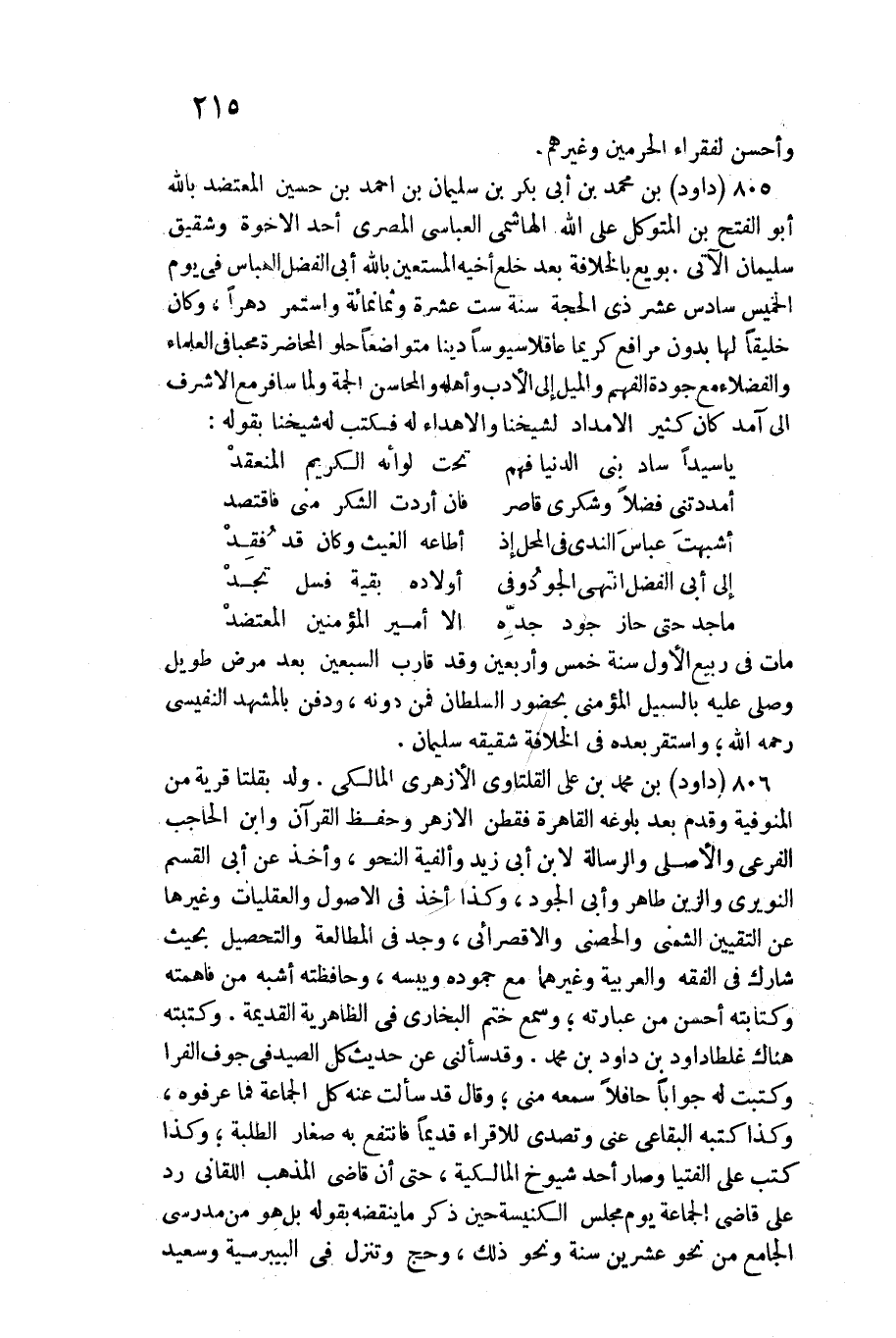 805 - دَاوُد بن مُحَمَّد بن أبي بكر بن سُلَيْمَان بن أَحْمد بن حُسَيْن المعتضد بِاللَّه أَبُو الْفَتْح بن المتَوَكل على الله الْهَاشِمِي العباسي الْمصْرِيّ أحد الْأُخوة وشقيق سُلَيْمَان / الْآتِي. بُويِعَ بالخلافة بعد خلع أَخِيه المستعين بِاللَّه أبي الْفضل الْعَبَّاس فِي يَوْم الْخَمِيس سادس عشر ذِي الْحجَّة سنة سِتّ عشرَة وَثَمَانمِائَة وَاسْتمرّ دهرا، وَكَانَ خليقا لَهَا بِدُونِ مرافع كَرِيمًا عَاقِلا سيوسا دينا متواضعا حُلْو المحاضرة محبا فِي الْعلمَاء والفضلاء مَعَ جودة الْفَهم والميل إِلَى الْأَدَب وَأَهله والمحاسن الجمة وَلما سَافر مَعَ الْأَشْرَف إِلَى آمد كَانَ كثير الامداد لشَيْخِنَا والاهداء لَهُ فَكتب لَهُ شَيخنَا بقوله: