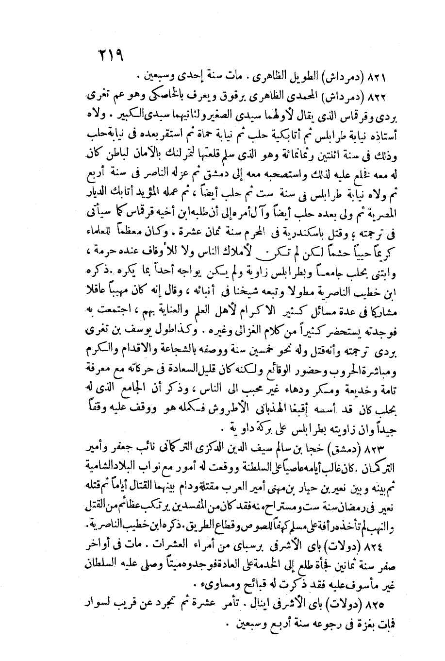 822 - دمرداش المحمدي الظَّاهِرِيّ برقوق وَيعرف بالخاصكي / وَهُوَ عَم تغري بردى وقرقماس الَّذِي يُقَال لأولهما سَيِّدي الصَّغِير ولثانيهما سَيِّدي الْكَبِير. ولاه أستاذه نِيَابَة طرابلس ثمَّ أتابكية حلب ثمَّ نِيَابَة حماة ثمَّ اسْتَقر بعده فِي نِيَابَة حلب وَذَلِكَ فِي سنة اثْنَتَيْنِ وَثَمَانمِائَة وَهُوَ الَّذِي سلم قلعتها لتمرلنك بالأمان لباطن كَانَ لَهُ مَعَه فَخلع عَلَيْهِ لذَلِك واستصحبه مَعَه إِلَى دمشق ثمَّ عَزله النَّاصِر فِي سنة أَربع ثمَّ ولاه نياب طرابلس فِي سنة سِتّ ثمَّ حلب أَيْضا، ثمَّ عمله الْمُؤَيد أتابك الديار المصرية ثمَّ ولي بعده حلب أَيْضا وَآل أمره إِلَى أَن طلبه ابْن أَخِيه قرقماس كَمَا سَيَأْتِي فِي تَرْجَمته وَقتل باسكندرية فِي الْمحرم سنة ثَمَان عشرَة، وَكَانَ مُعظما للْعُلَمَاء كَرِيمًا حييا حشما لَكِن لم تكن لأملاك النَّاس وَلَا للأوقاف عِنْده حُرْمَة، وابتنى بحلب جَامعا وبطرابلس زَاوِيَة وَلم يكن يواجه أحدا بِمَا يكره. ذكره ابْن خطيب الناصرية مطولا وَتَبعهُ شَيخنَا فِي أنبائه، وَقَالَ إِنَّه كَانَ مهيبا عَاقِلا مشاركا فِي عدَّة مسَائِل كَثِيرَة الاكرام لأهل الْعلم والعناية بهم، اجْتمعت بِهِ فَوَجَدته يستحضر كثيرا من كَلَام الْغَزالِيّ وَغَيره. وَكَذَا طول يُوسُف بن تغري بردى تَرْجَمته وَأَنه قتل وَله نَحْو خمسين سنة وَوَصفه بالشجاعة والاقدام وَالْكَرم ومباشرة الحروب وَحُضُور الوقائع وَلكنه كن قَلِيل السَّعَادَة فِي حركاته مَعَ معرفَة تَامَّة وخديعة ومكر ودهاء غير محبب إِلَى النَّاس، وَذكر أَن الْجَامِع الَّذِي لَهُ بحلب كَانَ قد أسسه أقبغا الهذباني الأطروش فكمله هُوَ ووقف عَلَيْهِ وَقفا جيدا وَإِن زاويته بطرابلس على بركَة داوية.