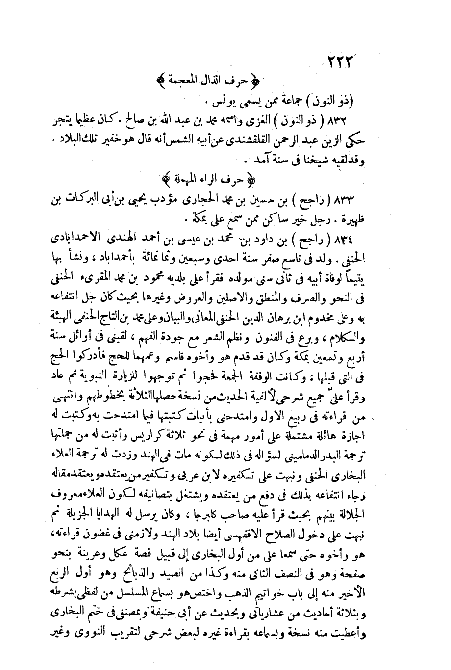 834 - رَاجِح بن دَاوُد بن مُحَمَّد بن عِيسَى بن أَحْمد الْهِنْدِيّ الاحمداباي الْحَنَفِيّ /. ولد فِي تَاسِع صفر سنة إِحْدَى وَسبعين وَثَمَانمِائَة بأحمداباد، وَنَشَأ بهَا يَتِيما لوفاة أَبِيه فِي ثَانِي سني مولده فقرا على بلديه مَحْمُود بن مُحَمَّد المقرىء الْحَنَفِيّ فِي النَّحْو وَالصرْف والمنطق والاصلين وَالْعرُوض وَغَيرهَا بِحَيْثُ كَانَ جلّ انتفاعه بِهِ وعَلى مخدوم ابْن برهَان الدّين الْحَنَفِيّ الْمعَانِي وَالْبَيَان وعَلى مُحَمَّد بن التَّاج الْحَنَفِيّ الْهَيْئَة وَالْكَلَام، وبرع فِي الْفُنُون ونظم الشّعْر مَعَ جودة الْفَهم، لَقِيَنِي فِي أَوَائِل سنة أَربع وَتِسْعين بِمَكَّة وَكَانَ قد قدم هُوَ وَأَخُوهُ قَاسم وعمهما لِلْحَجِّ فأدركوا الْحَج فِي الَّتِي قبلهَا، وَكَانَت الوقفة الْجُمُعَة فحجوا ثمَّ توجهوا للزيارة النَّبَوِيَّة ثمَّ عَاد وَقَرَأَ عَليّ جَمِيع شرحي لألفية الحَدِيث من نُسْخَة حصلها الثَّلَاثَة بخطوطهم وانْتهى من قِرَاءَته فِي ربيع الأول وامتدحني بِأَبْيَات كتبتها فِيمَا امتدحت بِهِ وكتبت لَهُ إجَازَة هائلة مُشْتَمِلَة على أُمُور مهمة فِي نَحْو ثَلَاثَة كراريس وَأثبت لَهُ من جُمْلَتهَا تَرْجَمَة الْبَدْر الدماميني لسؤاله فِي ذَلِك لكَونه مَاتَ فِي الْهِنْد وزدت لَهُ تَرْجَمَة الْعَلَاء البُخَارِيّ الْحَنَفِيّ ونبهت على تكفيره لِابْنِ عَرَبِيّ وتكفير من يَعْتَقِدهُ ويعتقد مقاله وَجَاء انتفاعه بذلك فِي دفع من يَعْتَقِدهُ ويشتغل بتصانيفه لكَون الْعَلَاء مَعْرُوف الْجَلالَة بَينهم بِحَيْثُ قَرَأَ عَلَيْهِ صَاحب كلبرجا، وَكَانَ يُرْسل لَهُ الْهَدَايَا الجزيلة ثمَّ نبهت على دُخُول الصّلاح الاقفهسي أَيْضا بِلَاد الْهِنْد ولازمني فِي غُضُون قِرَاءَته، هُوَ وَأَخُوهُ حَتَّى سمعا عَليّ من أول البُخَارِيّ إِلَى قبيل قصَّة عكل وعرينة بِنَحْوِ صفحة وَهُوَ فِي النّصْف الثَّانِي مِنْهُ وَكَذَا من الصَّيْد والذبائح وَهُوَ أول الرّبع الْأَخير مِنْهُ إِلَى بَاب خَوَاتِيم الذَّهَب واختص هُوَ بِسَمَاع المسلسل من لَفْظِي بِشَرْطِهِ وبثلاثة أَحَادِيث من عشارياتي وَبِحَدِيث عَن أبي حنيفَة وبمصنفي فِي ختم البُخَارِيّ وَأعْطيت مِنْهُ نُسْخَة وبسماعه بِقِرَاءَة غَيره لبَعض)