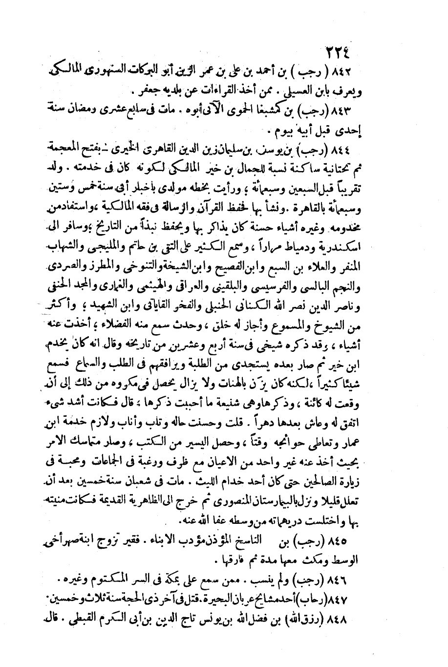 رَجَب بن أَحْمد بن عَليّ بن عمر الزين أَبُو البركات السنهوري الْمَالِكِي وَيعرف بِابْن العسيلي. مِمَّن أَخذ الْقرَاءَات عَن بلديه جَعْفَر. رَجَب بن كمشبغا الْحَمَوِيّ الْآتِي أَبوهُ. مَاتَ فِي سَابِع عشري رَمَضَان سنة إِحْدَى قبل أَبِيه بِيَوْم. رَجَب بن يُوسُف بن سُلَيْمَان زين الدّين القاهرية الخيري بِفَتْح الْمُعْجَمَة ثمَّ تَحْتَانِيَّة سَاكِنة نِسْبَة للجمال بن خير الْمَالِكِي لكَونه كَانَ فِي خدمته. ولد تَقْرِيبًا قبل السّبْعين وَسَبْعمائة وَرَأَيْت بِخَطِّهِ مولدِي بأخبار أبي سنة خمس وَسِتِّينَ وَسَبْعمائة بِالْقَاهِرَةِ. وَنَشَأ بهَا فحفظ الْقُرْآن والرسالة فِي فقه الْمَالِكِيَّة، واستفاد من مخدومه وَغَيره أَشْيَاء حَسَنَة كَانَ يذاكر بهَا ويحفظ نبذا من التَّارِيخ وسافر إِلَى اسكندرية ودمياط مرَارًا، وَسمع الْكثير على التقي بن حَاتِم والمليجي والشهاب المنفر والْعَلَاء بن السَّبع وَابْن الفصيح وَابْن الشيخة والتنوخي والمطرز والصردي والنجم البالسي والفرسيسي والبلقيني والعراقي والهيثمي والغماري وَالْمجد الْحَنَفِيّ وناصر الدّين نصر الله الْكِنَانِي الْحَنْبَلِيّ وَالْفَخْر القاياتي وَابْن الشَّهِيد وَأكْثر من الشُّيُوخ والمسموع وَأَجَازَ لَهُ خلق، وَحدث سمع مِنْهُ الْفُضَلَاء أخذت عَنهُ أَشْيَاء، وَقد ذكره شَيْخي فِي سنة أَربع وَعشْرين من تَارِيخه وَقَالَ انه كَانَ يخْدم ابْن خير ثمَّ صَار بعده يستجدي من الطّلبَة ويرافقهم فِي الطّلب وَالسَّمَاع فَسمع شَيْئا كثيرا، لكنه كَانَ يزن بالهنات وَلَا يزَال يحصل فِي مَكْرُوه من ذَلِك إِلَى أَن وَقعت لَهُ كائنة، وَذكرهَا وَهِي شنيعة مَا أَحْبَبْت ذكرهَا، قَالَ فَكَانَت أَشد شَيْء اتّفق لَهُ وعاش بعْدهَا دهرا. قلت وَحسنت حَاله وَتَابَ وأناب ولازم خدمَة ابْن عمار وتعاطى حَوَائِجه وقتا، وَحصل الْيَسِير من الْكتب، وَصَارَ متماسك الْأَمر بِحَيْثُ أَخذ عَنهُ غير وَاحِد من الْأَعْيَان مَعَ ظرف ورغبة فِي الْجَمَاعَات ومحبة فِي زِيَارَة الصَّالِحين حَتَّى كَانَ أحد خدام اللَّيْث. مَاتَ فِي شعْبَان سنة خمسين بعد أَن تعلل قَلِيلا وَنزل بالبيمارستان المنصوري ثمَّ خرج إِلَى الظَّاهِرِيَّة الْقَدِيمَة فَكَانَت منيته بهَا واختلست دريهماته من وَسطه عَفا الله عَنهُ. رَجَب بن النَّاسِخ الْمُؤَذّن مؤدب الابناء. فَقير تزوج ابْنة صهر أخي الْوسط وَمكث مَعهَا مُدَّة ثمَّ فَارقهَا. رَجَب وَلم ينْسب. مِمَّن سمع عَليّ بِمَكَّة فِي السِّرّ المكتوم وَغَيره.)