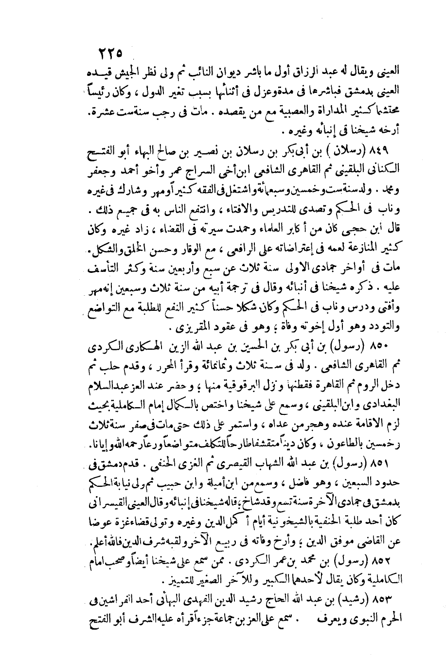 ولد فِي سنة ثَلَاث وَثَمَانمِائَة وَقَرَأَ الْمُحَرر، وَقدم حلب ثمَّ دخل الرّوم ثمَّ الْقَاهِرَة فقطنها وَنزل البرقوقية مِنْهَا وَحضر عِنْد الْعِزّ عبد السَّلَام الْبَغْدَادِيّ وَابْن البُلْقِينِيّ، وَسمع على شَيخنَا واختص بالكمال إِمَام الكاملية بِحَيْثُ لزم الْإِقَامَة عِنْده وهجر من عداهُ، وَاسْتمرّ على ذَلِك حَتَّى مَاتَ فِي صفر سنة ثَلَاث وَخمسين بالطاعون، وَكَانَ دينا متقشفا طارحا للتكلف متواضعا ورعا رَحمَه الله وإيانا. رَسُول بن عبد الله الشهَاب القيصري ثمَّ الْغَزِّي الْحَنَفِيّ. ثمَّ ولي نِيَابَة الحكم حُدُود السّبْعين، وَهُوَ فَاضل، وَسمع من ابْن أميلة وَابْن حبيب ثمَّ ولي نِيَابَة الحكم بِدِمَشْق فِي جُمَادَى الْآخِرَة سنة تسع وَقد شاخ قَالَه شَيخنَا فِي إنبائه وَقَالَ الْعَيْنِيّ القيسراني كَانَ أحد طلبة الْحَنَفِيَّة بالشيخونية أَيَّام أكمل الدّين وَغَيره وَتَوَلَّى قَضَاء غَزَّة عوضا عَن القَاضِي موفق الدّين وأرخ وَفَاته فِي ربيع الآخر ولقبه شرف الدّين فَالله أعلم.) ::: رَسُول بن مُحَمَّد بن عمر الْكرْدِي. مِمَّن سمع على شَيخنَا أَيْضا وَصَحب إِمَام الكاملية وَكَانَ يُقَال لأَحَدهمَا الْكَبِير وَللْآخر الصَّغِير للتمييز. رشيد بن عبد الله الْحَاج رشيد الدّين الفهدي البهائي أحد الفراشين فِي الْحرم النَّبَوِيّ وَيعرف. سمع على الْعِزّ بن جمَاعَة جُزْءا قَرَأَهُ عَلَيْهِ الشّرف أَبُو الْفَتْح