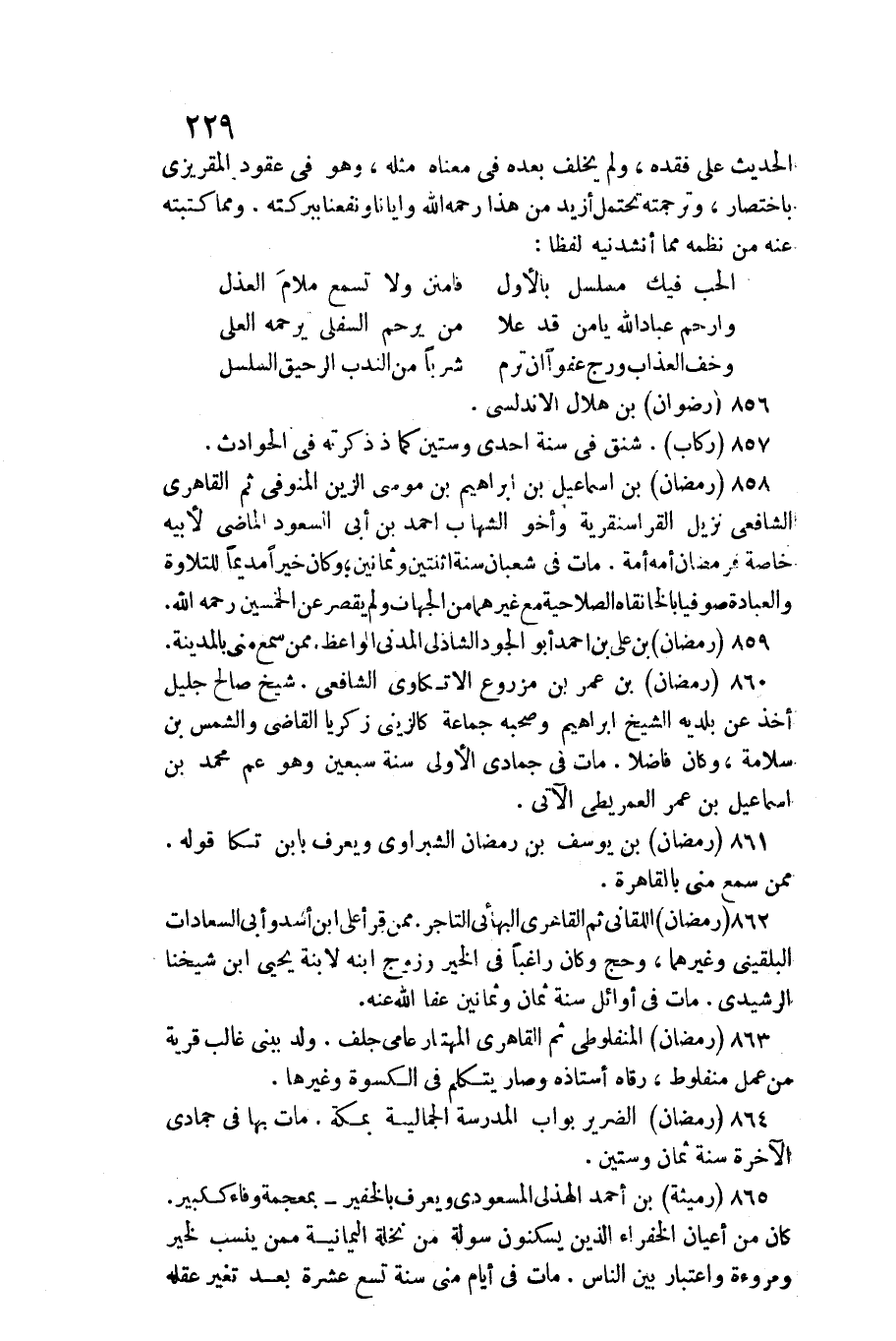 858 - رَمَضَان بن إِسْمَاعِيل بن إِبْرَاهِيم بن مُوسَى الزين المنوفي ثمَّ القاهري الشَّافِعِي نزيل القراسنقرية وأخو الشهَاب أَحْمد بن أبي السُّعُود / الْمَاضِي لِأَبِيهِ خَاصَّة فرمضان أمه أمة. مَاتَ فِي شعْبَان سنة اثْنَتَيْنِ وَثَمَانِينَ وَكَانَ خيرا مديما للتلاوة وَالْعِبَادَة صوفيا بالخانقاه الصلاحية مَعَ غَيرهمَا من الْجِهَات وَلم يقصر عَن الْخمسين رَحمَه الله.