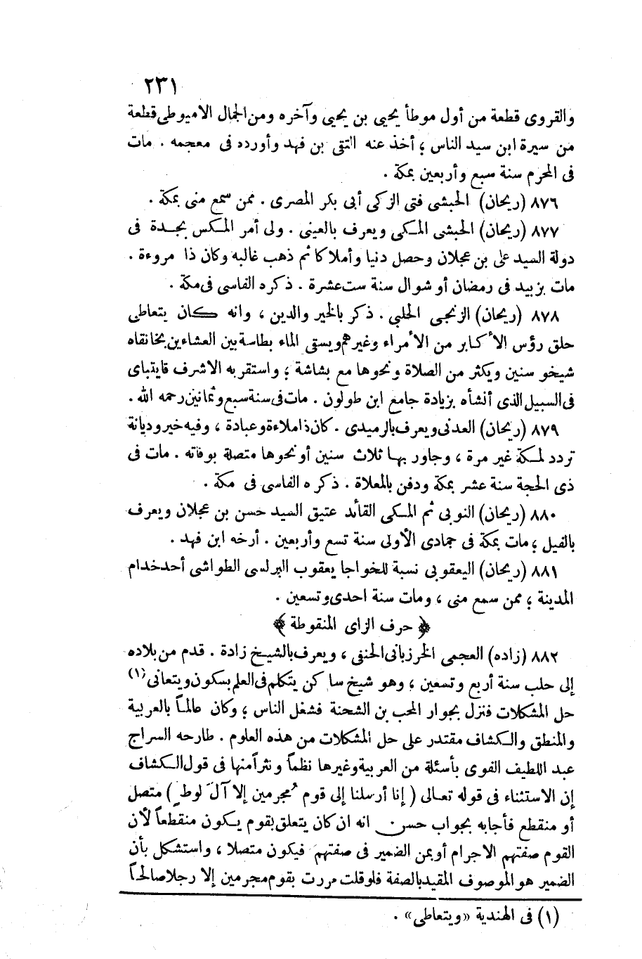 882 - زَاده العجمي الخرزباني الْحَنَفِيّ، وَيعرف بالشيخ زادة. / قدم من بِلَاده إِلَى حلب سنة أَربع وَتِسْعين، وَهُوَ شيخ سَاكن يتَكَلَّم فِي الْعلم بِسُكُون ويتعانى حل المشكلات فَنزل بجوار الْمُحب بن الشّحْنَة فشغل النَّاس وَكَانَ عَالما بِالْعَرَبِيَّةِ والمنطق والكشاف مقتدر على حل المشكلات من هَذِه الْعُلُوم. طارحه السراج عبد اللَّطِيف الفوي بأسئلة من الْعَرَبيَّة وَغَيرهَا نظما ونثرا مِنْهَا فِي قَول الْكَشَّاف إِن الِاسْتِثْنَاء فِي قَوْله تَعَالَى إِنَّا أرسلنَا إِلَى قوم مجرمين إِلَّا آل لوط مُتَّصِل أَو مُنْقَطع فَأَجَابَهُ بِجَوَاب حسن أَنه إِن كَانَ يتَعَلَّق بِقوم يكون مُنْقَطِعًا لِأَن الْقَوْم صفتهمْ الاجرام أَو بِمن الضَّمِير فِي صفتهمْ فَيكون مُتَّصِلا، وَاسْتشْكل بِأَن الضَّمِير هُوَ الْمَوْصُوف الْمُقَيد بِالصّفةِ فَلَو قلت مَرَرْت بِقوم مجرمين إِلَّا رجلا صَالحا