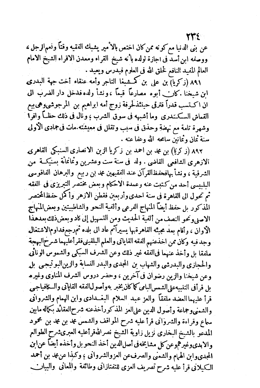 892 - زَكَرِيَّا بن مُحَمَّد بن أَحْمد بن زَكَرِيَّا الزين الْأنْصَارِيّ السنبكي القاهري الْأَزْهَرِي الشَّافِعِي القَاضِي. / ولد فِي سنة سِتّ وَعشْرين وَثَمَانمِائَة بسنيكة من الشرقية، وَنَشَأ بهَا فحفظ الْقُرْآن عِنْد الفقيهين مُحَمَّد بن ربيع والبرهان الفاقوسي البلبيسي أحد من كتبت عَنهُ وعمدة الاحكام وَبَعض مُخْتَصر التبريزي فِي الْفِقْه ثمَّ تحول إِلَى الْقَاهِرَة فِي سنة إِحْدَى وَأَرْبَعين فقطن الْأَزْهَر وأكمل حفظ الْمُخْتَصر الْمَذْكُور بل حفظ أَيْضا الْمِنْهَاج الفرعي وألفية النَّحْو)