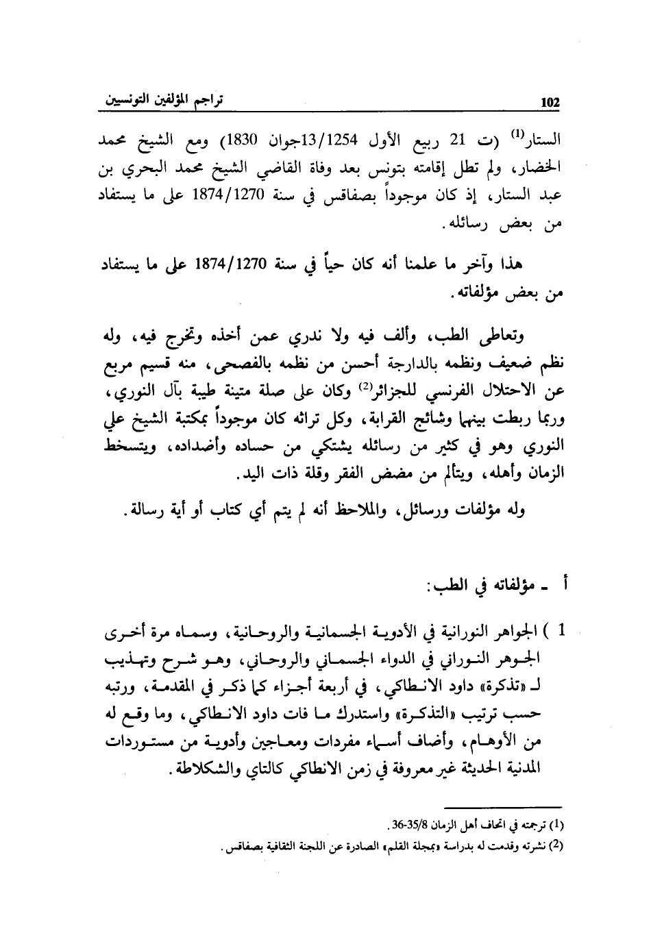 الستار (¬1) (ت 21 ربيع الأول 1254/ 13 جوان 1830) ومع الشيخ محمد الخضار، ولم تطل إقامته بتونس بعد وفاة القاضي الشيخ محمد البحري بن عبد الستار، إذ كان موجودا بصفاقس في سنة 1270/ 1874 على ما يستفاد من بعض رسائله.