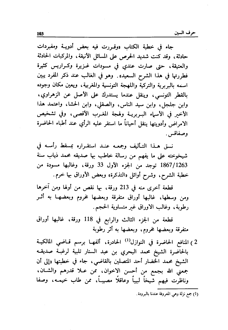 2) المنافع الحاضرة في النوازل (¬1) الحادرة، ألفها برسم قاضي المالكية بالحاضرة الشيخ محمد البحري بن عبد الستار تلبية لرغبة صديقه الشيخ محمد الخضار أحد المتصلين بالقاضي، جاء في خطبتها «إلى أن جمعني الله بجمع من أحسن الاخوان، ممن علا قدرهم والشان، وناظرت فيهم شيخا لبيبا وعاقلا مصيبا، ممن طاب خيمه، وصفا