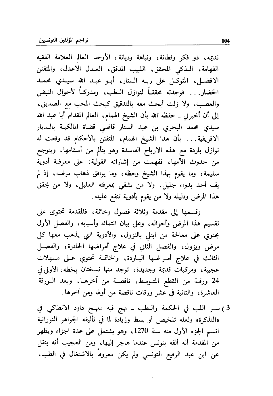 3) سر اللب في الحكمة والطب - نهج فيه منهج داود الانطاكي في «التذكرة» ولعله تلخيص أو بسط وزيادة لما في تأليفه الجواهر النورانية اتسم الجزء الأول منه سنة 1270، وهو يشتمل على عدة اجزاء ويظهر من المقدمة أنه ألفه بتونس عند ما هاجر إليها، ومن العجيب أنه ينقل عن ابن عبد الرفيع التونسي ولم يكن معروفا بالاشتغال في الطب،